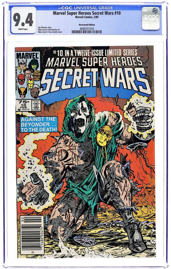 Newsstand Edition. "Death to the Beyonder!" Part 10 of 12. Story by Jim Shooter. Art by Mike Zeck and John Beatty. It's Doctor Doom vs. the Beyonder. The nefarious villain has stolen vast amounts of cosmic energy from mighty Galactus and now stands in defiance before the nigh omnipotent Beyonder. What follows is a battle that will rock the cosmos, and only one shall survive. 36 pages, full color. Cover price $0.75.