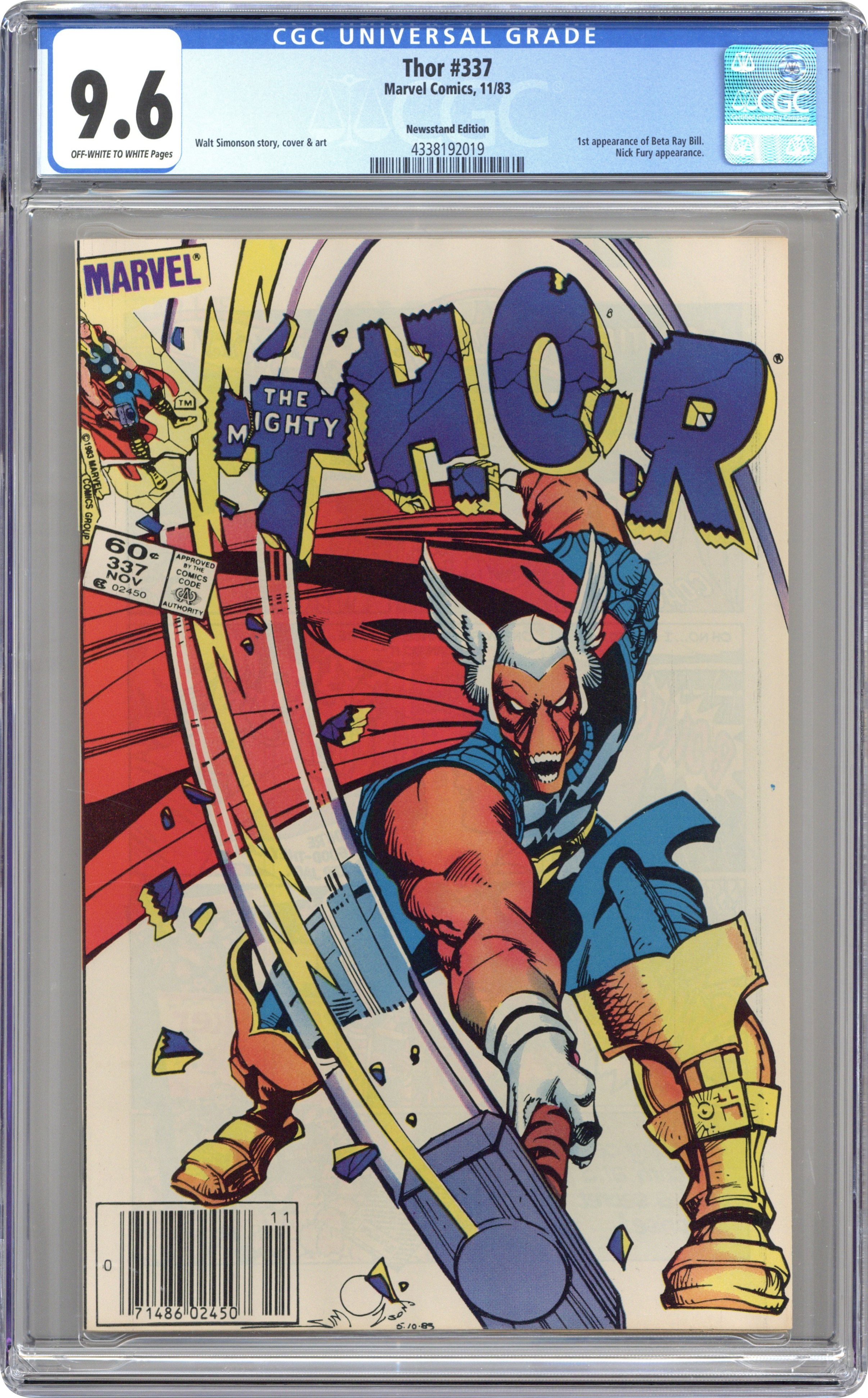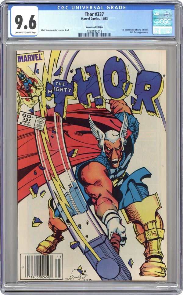 Ends Feb 16 9:45 PM CST Bid History 6 bids Current Bid $44 Your Secret Max Bid If you'd like to bid, please log in or register. Newsstand Edition. Cover by Walt Simonson. Beta Ray Bill (first appearance) becomes Thor in "Doom!", script and art by Walt Simonson; Nick Fury asks Thor's aid in investigating an alien ship heading for earth; Thor arrives and triggers the awakening of an alien protector, Beta Ray Bill; Bill bests Thor and takes up his hammer only to be accidentally summoned to Asgard by Odin who thinks he is summoning Thor. Brief appearances by Nick Fury, Loki, Sif, Balder, Heimdall, Volstagg, and Odin. First appearance of Lorelei (sister of the Enchantress). Begins Walt Simonson's run on Thor (through #382). Bullpen Bulletins. Star Frontiers TSR ad. 36 pgs., full color. $0.60. Cover price $0.60.