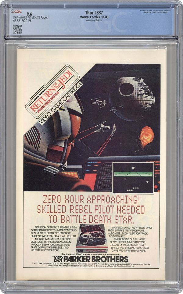 $135.00Newsstand Edition. Cover by Walt Simonson. Beta Ray Bill (first appearance) becomes Thor in "Doom!", script and art by Walt Simonson; Nick Fury asks Thor's aid in investigating an alien ship heading for earth; Thor arrives and triggers the awakening of an alien protector, Beta Ray Bill; Bill bests Thor and takes up his hammer only to be accidentally summoned to Asgard by Odin who thinks he is summoning Thor. Brief appearances by Nick Fury, Loki, Sif, Balder, Heimdall, Volstagg, and Odin. First appearance of Lorelei (sister of the Enchantress). Begins Walt Simonson's run on Thor (through #382). Bullpen Bulletins. Star Frontiers TSR ad. 36 pgs., full color. $0.60. Cover price $0.60.