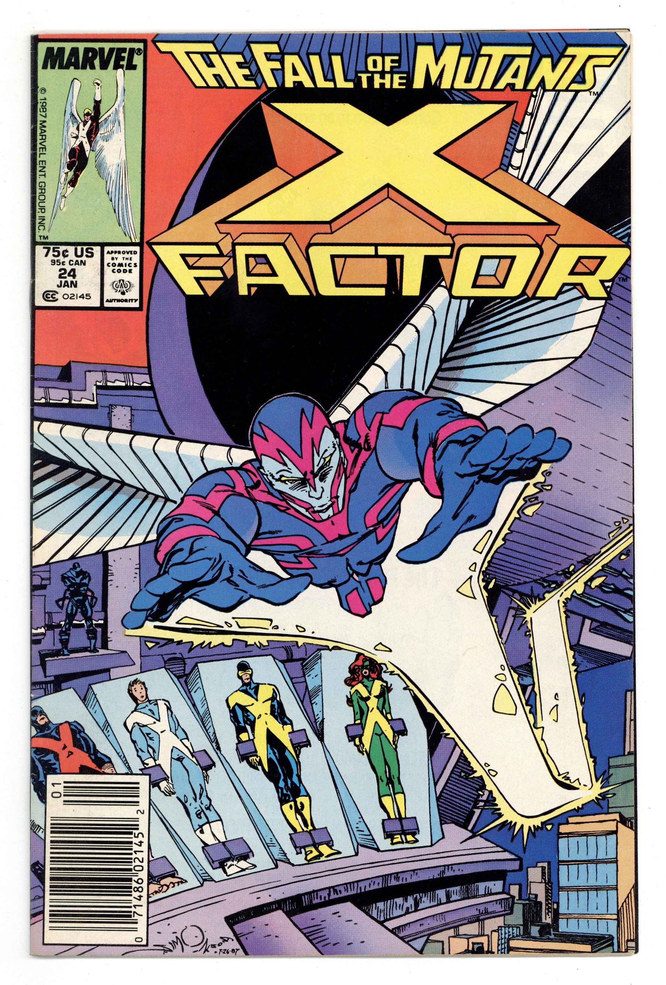 Newsstand Edition. Fall of the Mutants! Part 1 of 3. "Masks!" 1st full appearance of Archangel. Story by Louise Simonson. Art by Walter Simonson and Bob Wiacek. One of the biggest mutant events to ever hit the comic racks begins here. The powerful mutant known as Apocalypse finally makes his move and unleashes his Four Horseman on an unsuspecting world. The only thing standing between humanity and total annihilation is X-Factor. However when the fourth and final Horseman, Death, reveals his true identity, the group will be rocked to its very core. This is a pivotal chapter in the lives of the original X-Men. Cover price $0.75.