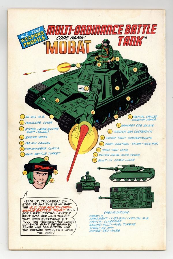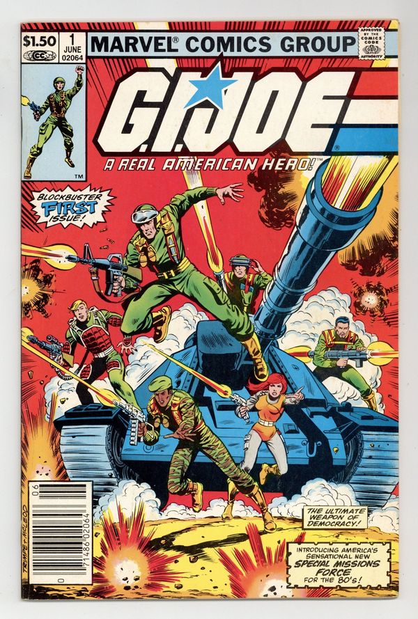 Starts Apr 27 Newsstand Edition. Giant size issue - "Operation: Lady Doomsday!" Written by Larry Hama. Art by Herb Trimpe and Bob McLeod. Cobra is a sinister terrorist organization bent on world domination! There is only one thing standing in their way - GI Joe, the free world's elite strike force and a band of highly trained super soldiers who fight for freedom, justice and the American way. Yo, Joe! 1st appearance of Hawk, Snake-eyes, Scarlett, Clutch, Rock 'n' Roll, Stalker, Breaker, Flash, Grand Slam, Short-Fuse, Grunt, Cobra Commander and the Baroness. Includes back-up story "Hot Potato!" Written by Larry Hama. Art by Don Perlin and Jack Abel. Starring Snake-eyes, Scarlett, and Rock 'n' Roll. Also includes a 2-page diagram of "The Pit," the G.I. Joe Command Center. 52 pages, FC. Cover price $1.50.