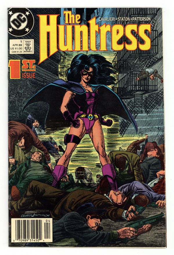 Starts Jul 4 Newsstand Edition. She stalks the animals who prey on the innocent. She's the new Huntress, a woman for whom all semblance of a normal life ended when she was young. She was kidnapped when she was a child. Her family was murdered by criminals when she was in college. Both events hardened her heart and darkened her outlook. Who is Helena Bertinelli, the woman behind the mask of this all-new version of one of DC's most popular heroines? The story comes together here in THE HUNTRESS #1 as we begin to pierce the deadly "Code of Silence" that surrounds her and the terrible tragedies that have reshaped and redefined her life. Written by Joey Cavalieri, with pencils by Joe Staton and full craft-tint inks by Bruce Patterson. Cover by Staton and Patterson. Note: First appearance of third Huntress (Helena Bertinelli). Cover price $1.00.
