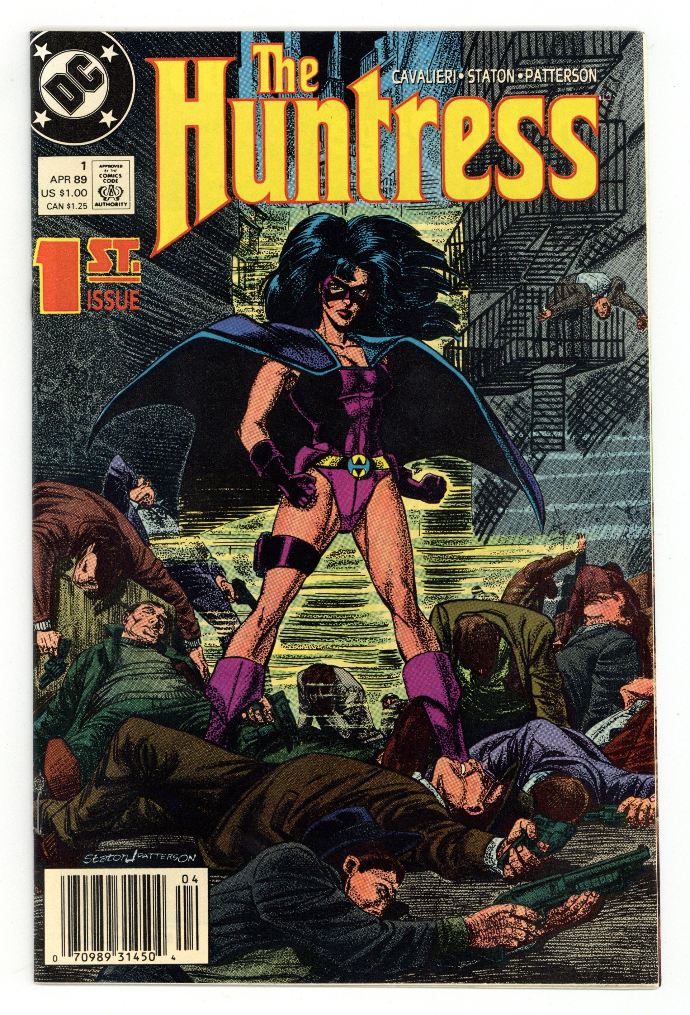 Newsstand Edition. She stalks the animals who prey on the innocent. She's the new Huntress, a woman for whom all semblance of a normal life ended when she was young. She was kidnapped when she was a child. Her family was murdered by criminals when she was in college. Both events hardened her heart and darkened her outlook. Who is Helena Bertinelli, the woman behind the mask of this all-new version of one of DC's most popular heroines? The story comes together here in THE HUNTRESS #1 as we begin to pierce the deadly "Code of Silence" that surrounds her and the terrible tragedies that have reshaped and redefined her life. Written by Joey Cavalieri, with pencils by Joe Staton and full craft-tint inks by Bruce Patterson. Cover by Staton and Patterson. Note: First appearance of third Huntress (Helena Bertinelli). Cover price $1.00.