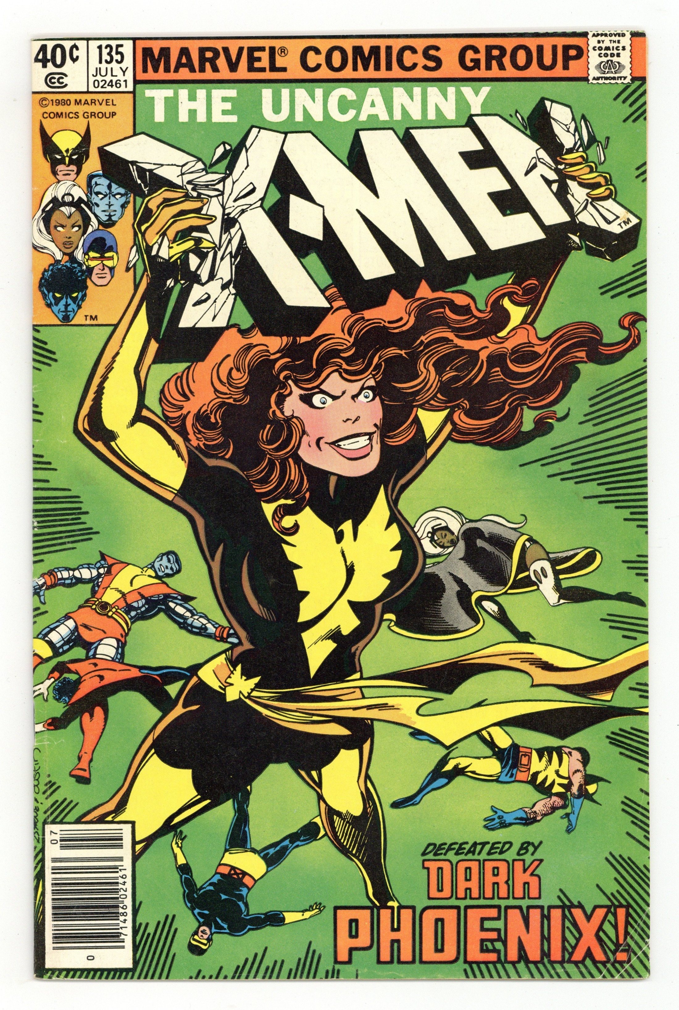 Newsstand Edition. The Dark Phoenix Saga: Part 7 of 9 - "Dark Phoenix!" Cameos by the Fantastic Four, Spider-Man, Doctor Strange, and the Silver Surfer. Story by Chris Claremont and John Byrne. Art by John Byrne and Terry Austin. The unfettered might of the Dark Phoenix is unleashed upon an unsuspecting universe, and the repercussions oar terrible. What can the X-Men do to stop their teammate who has gone mad with unimaginable power? 36 pgs. Cover price $0.40.
