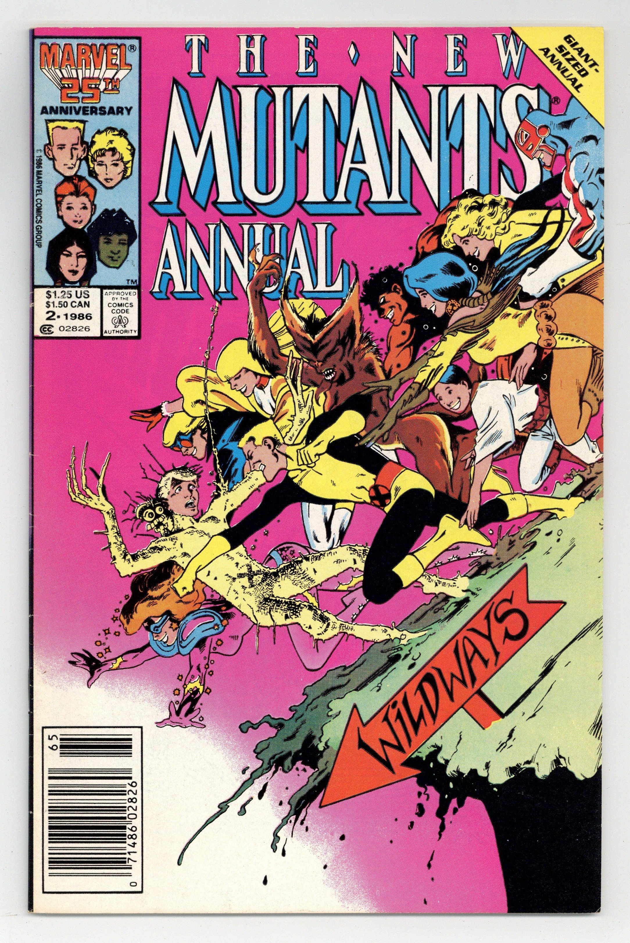 Tags: X-Men$28.00Newsstand Edition. First U.S. appearances of Psylocke and Meggan in "Why Do We Do These Things We Do?!" Mojo captures Betsy (giving her new eyes and the name Psylocke), then Wolfsbane, Sunspot, Karma's siblings and the Bratpack; the New Mutants meet Captain Britain; Cypher merges with Warlock. Characters: Cannonball, Cypher, Karma, Magik, Magma, Mirage, Sunspot, Warlock, Wolfsbane; GS: Captain Britain, Psylocke (Betsy Braddock; O; first U.S. appearance), Bratpack; V: Mojo, Spiral; GA: Meggan (first U.S. appearance); OC: Leong and Nga Xui Manh. Script by Chris Claremont, with art and cover by Alan Davis. Notes: This story occurs between New Mutants (1983 1st Series) #44 & #45; Spiral, Mojo and the Bratpack (Butch, Darla and Alfie) appear here following the Longshot limited series; a sequel to this story appears in Uncanny X-Men (1963) Annual #10. Cover price $1.25.