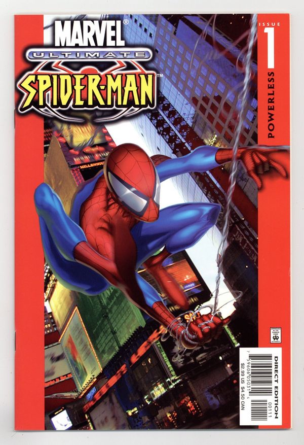 Original Edition. Cover by Joe Quesada. Written by Brian Michael Bendis, art by Mark Bagley and Art Thibert. 1st "Ultimate" title, presenting the origin of Spider-man to a new generation of fans. Bendis' crisp characterizations and dead-on dialogue combine with Bagley's years of experience and the ability to continually deliver dynamic super hero storytelling to thrill old and new audiences alike. Cover price $2.99.