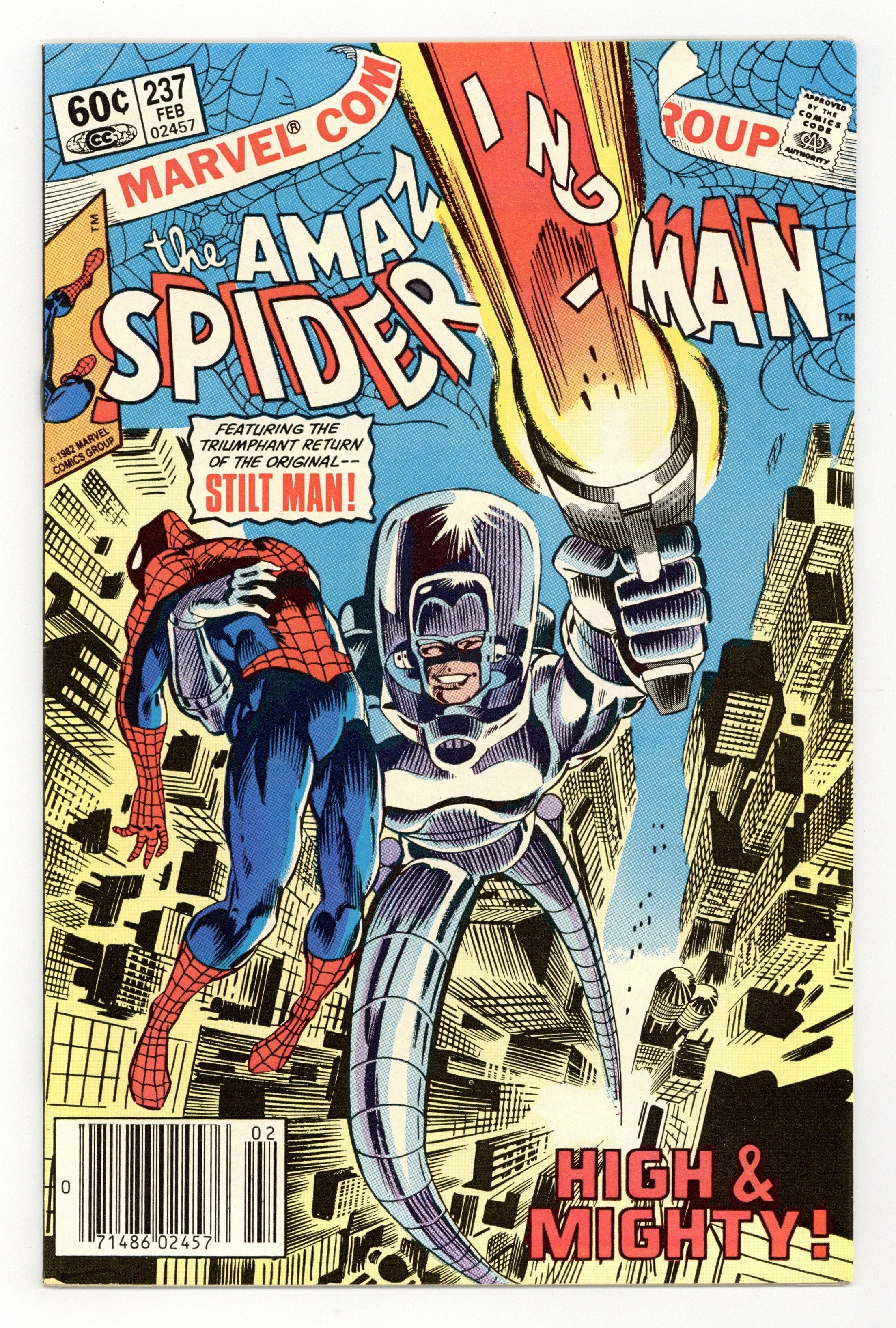 Newsstand Edition. "High & Mighty!" Plot by Roger Stern. Script by Bill Mantlo. Art by Bob Hall (breakdowns) and Frank Giacoia (finishes). Cover design by Ed Hannigan. The original Stilt-Man is down on his luck and desperately wants to reverse his fortune! So he decides to challenge the only superhero he has ever beaten...Spider-Man! After breaking into Cordco's R&D laboratory and improving his battlesuit, the Stilt-Man surprisingly gets his chance! The web-slinger just happens to be in the neighborhood! Will the Stilt-Man remain undefeated against the wall-crawler? Or can Spidey even the score? (Notes: The Stilt-Man previously appeared in Daredevil 186. The letters page contains a preview of the cover to Amazing Spider-Man 238 (depicting the Hobgoblin). This issue includes a full-page ad featuring the Hulk and the Magic Snake Puzzle.) 36 pages Cover price $0.60.