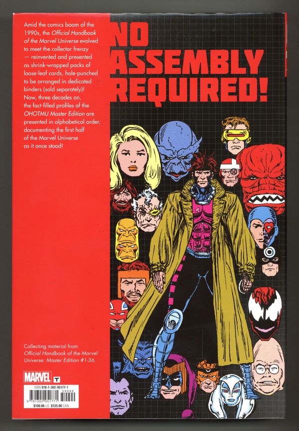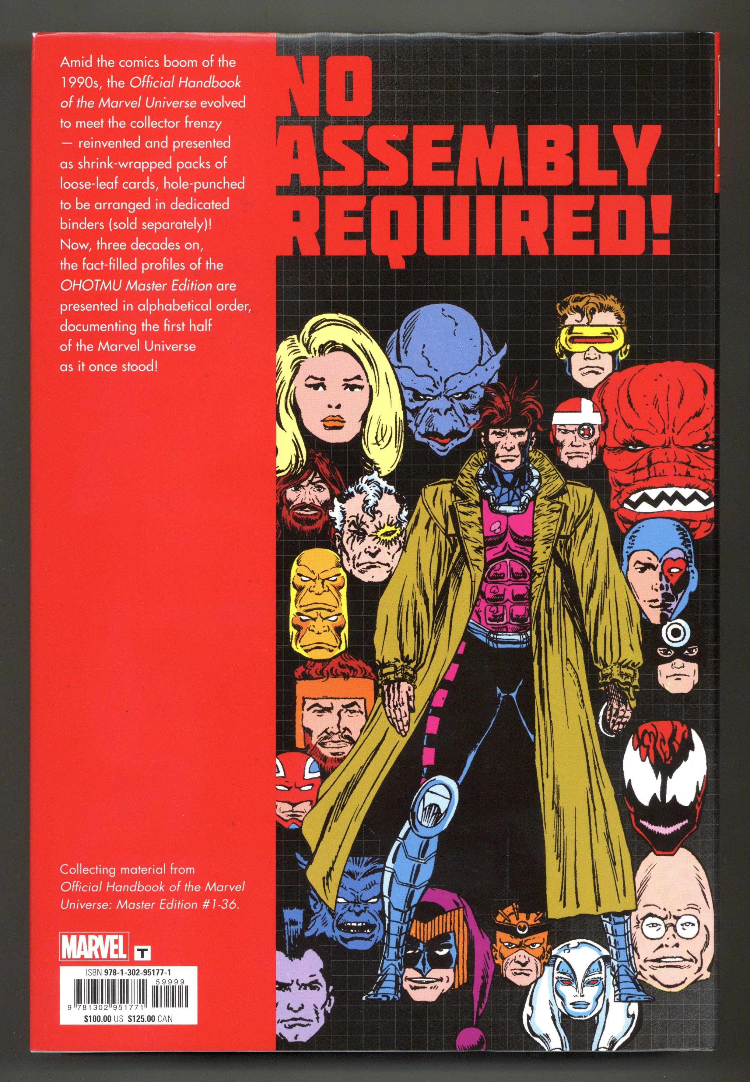 1st printing. Collects material from The Official Handbook of the Marvel Universe Master Edition (1990-1993) #1-36 (A-L profiles). Written and Researched by Mark Gruenwald, Glenn Herdling, Len Kaminski, Peter Sanderson, Murray Ward, and Jamie Tost. Art by Keith Pollard, Darren Auck, Kieron Dwyer, Manny Galan, Steve Geiger, Don Heck, Rik Levins, Scott McDaniel, Al Milgrom, Paul Neary, Michael Netzer, George Perez, Paul Ryan, Javier Saltares, Bill Wylie, and Joe Rubenstein. Cover by Barry Kitson, Rik Levins, Al Milgrom, Scott McDaniel, Javier Saltares, Joe Rubenstein, and Andy Yanchus. Amid the comics boom of the 1990s, THE OFFICIAL HANDBOOK OF THE MARVEL UNIVERSE evolved to meet the collector frenzy - reinvented and presented as shrink-wrapped packs of looseleaf cards, hole-punched to be assembled in dedicated binders (sold separately)! Now, at long last, these fact-filled profiles are collected in Omnibus format - and to save you the work, we've put them in alphabetical order! This inaugural volume presents the first half of the Marvel Universe as it stood in 1991-1993, from the Abomination to Lyja the Lazerfist - and the legions of heroes, villains and teams in between! Featuring front, back and side views of all your favorite characters, many making their OHOTMU debuts - including icons of the era Deadpool and Cable! Hardcover, 8 1/2-in. x 11-in., 888 pages, full color. Rated T Cover price $100.00.