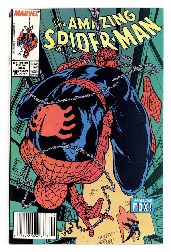 Tags: Spider-Man$25.00Newsstand Edition. "California Schemin'!" Part 1 of 2. Script by David Michelinie. Pencils by Todd McFarlane. Finishes by Joe Rubinstein. Cover by Todd McFarlane. The Daily Bugle publishes a book featuring Peter Parker's best photos of Spider-Man! And now the Bugle's ace photographer and Mary Jane are on their way to Los Angeles for the publicity tour! It should be all fun in the sun in the city of angels! But Peter's first promotional event at the L.A. civic center hits a snag when an old acquaintance shows up: the Black Fox! The wily fox steals a priceless chalice and the chase is on! Is the web-slinger ready for his Hollywood debut? Cameo appearances by Aunt May, J. Jonah Jameson, and the Prowler. First appearance of Jonathan Caesar. (Notes: The Black Fox previously appeared in Web of Spider-Man 15. The Amazing Spider-Man title was published bi-monthly for the next 5 issues.) 36 pgs. Cover price $1.00.