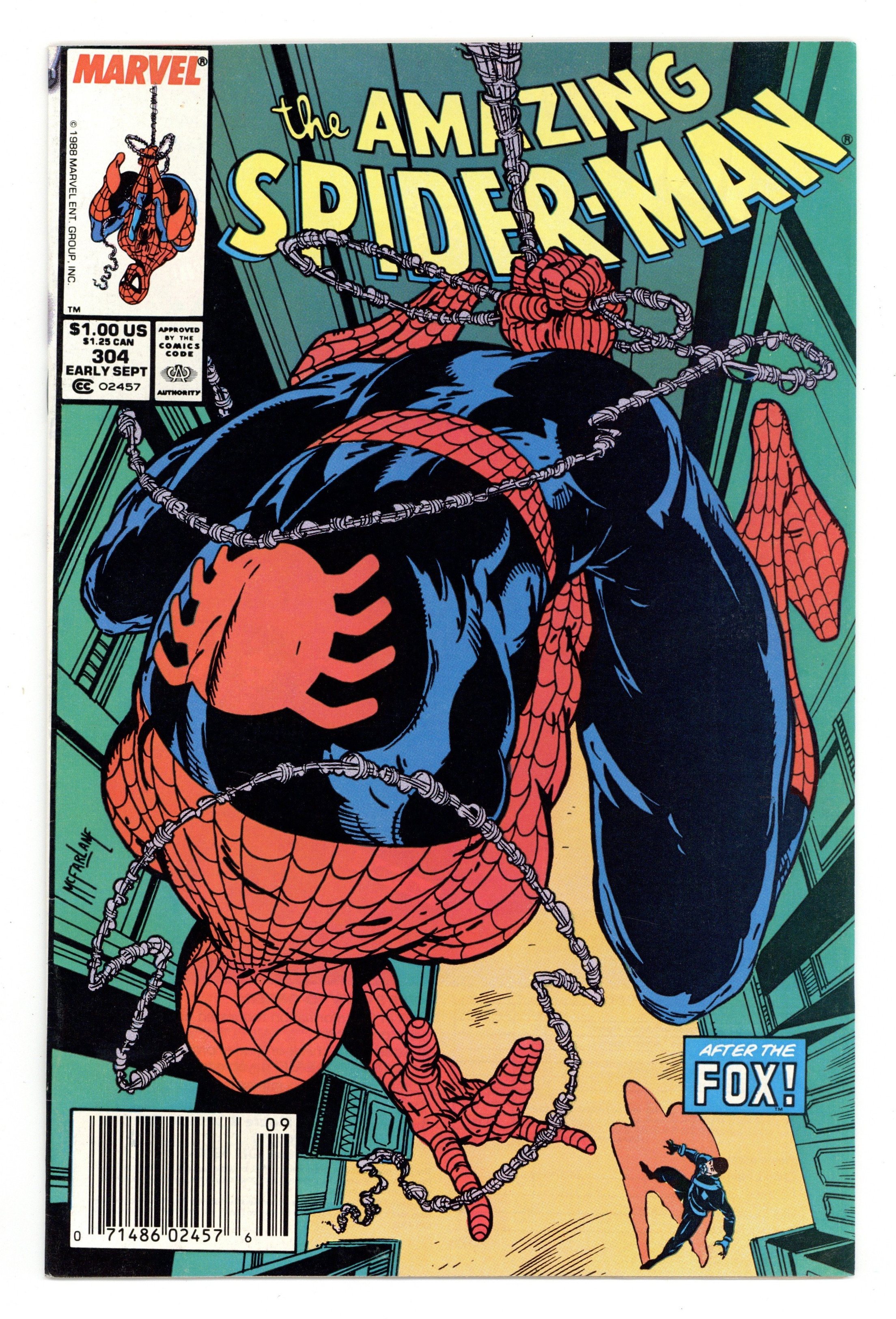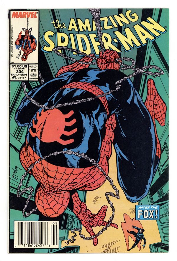 Tags: Spider-Man$15.75Newsstand Edition. "California Schemin'!" Part 1 of 2. Script by David Michelinie. Pencils by Todd McFarlane. Finishes by Joe Rubinstein. Cover by Todd McFarlane. The Daily Bugle publishes a book featuring Peter Parker's best photos of Spider-Man! And now the Bugle's ace photographer and Mary Jane are on their way to Los Angeles for the publicity tour! It should be all fun in the sun in the city of angels! But Peter's first promotional event at the L.A. civic center hits a snag when an old acquaintance shows up: the Black Fox! The wily fox steals a priceless chalice and the chase is on! Is the web-slinger ready for his Hollywood debut? Cameo appearances by Aunt May, J. Jonah Jameson, and the Prowler. First appearance of Jonathan Caesar. (Notes: The Black Fox previously appeared in Web of Spider-Man 15. The Amazing Spider-Man title was published bi-monthly for the next 5 issues.) 36 pgs. Cover price $1.00.