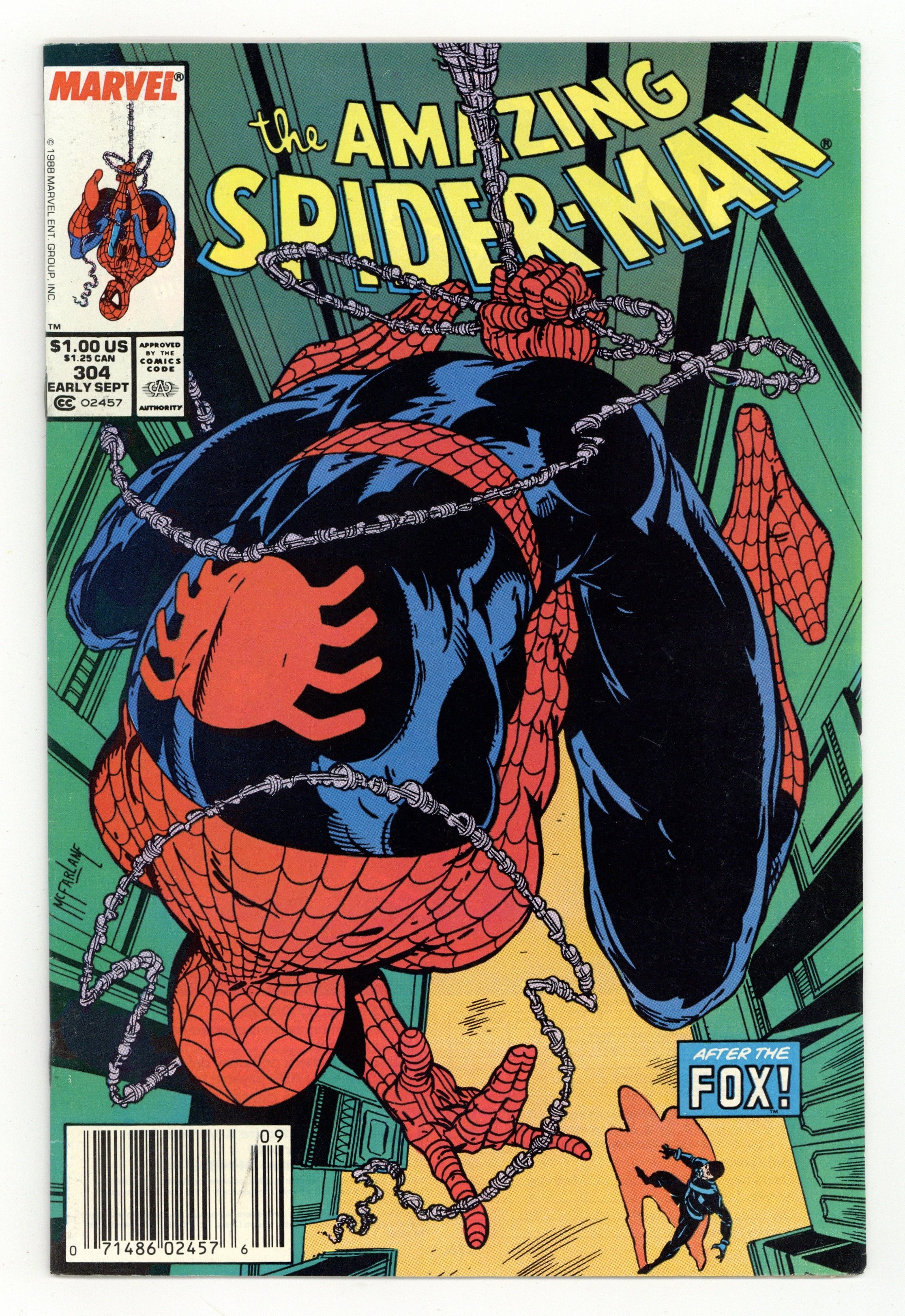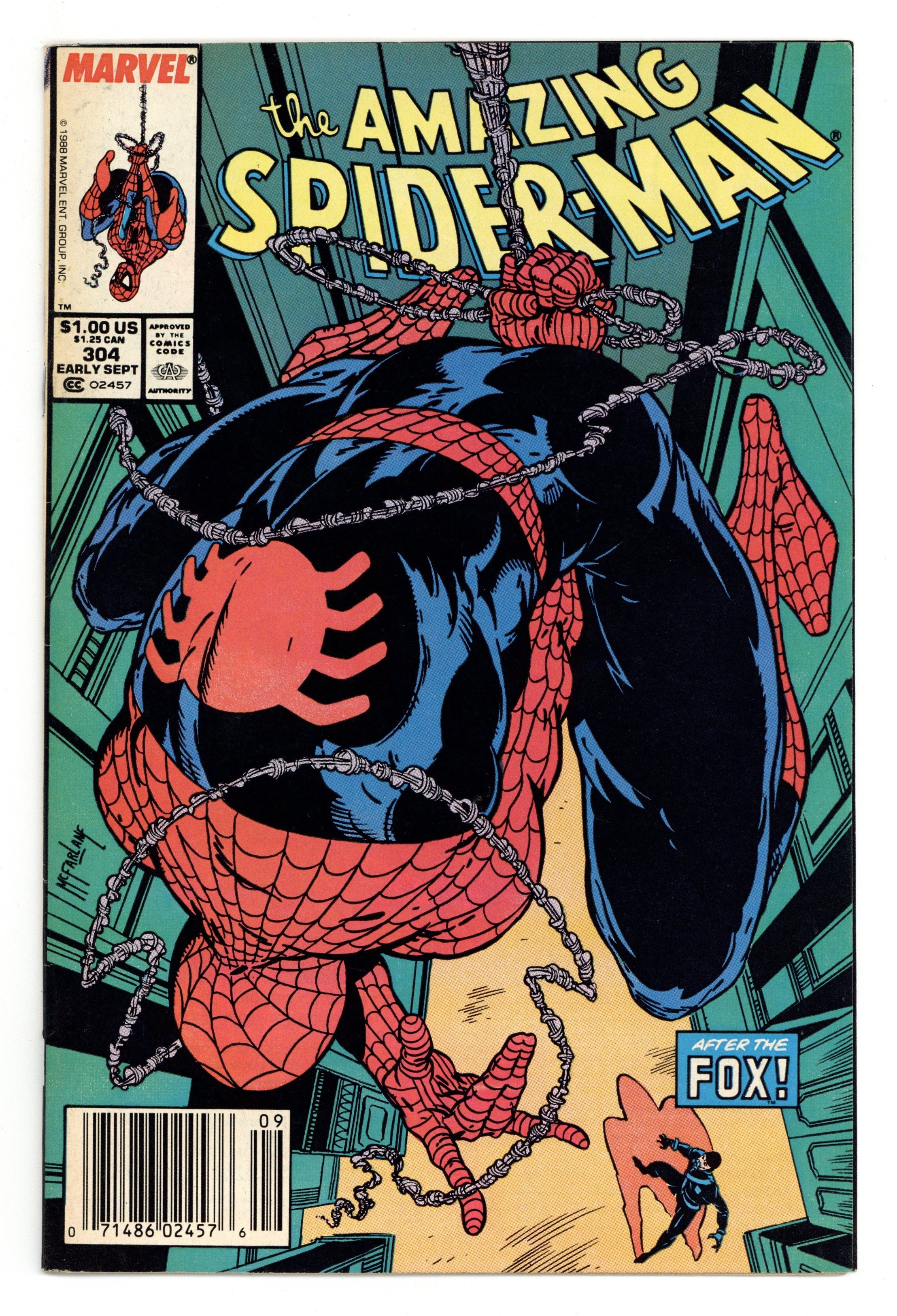 Tags: Spider-Man$19.00Newsstand Edition. "California Schemin'!" Part 1 of 2. Script by David Michelinie. Pencils by Todd McFarlane. Finishes by Joe Rubinstein. Cover by Todd McFarlane. The Daily Bugle publishes a book featuring Peter Parker's best photos of Spider-Man! And now the Bugle's ace photographer and Mary Jane are on their way to Los Angeles for the publicity tour! It should be all fun in the sun in the city of angels! But Peter's first promotional event at the L.A. civic center hits a snag when an old acquaintance shows up: the Black Fox! The wily fox steals a priceless chalice and the chase is on! Is the web-slinger ready for his Hollywood debut? Cameo appearances by Aunt May, J. Jonah Jameson, and the Prowler. First appearance of Jonathan Caesar. (Notes: The Black Fox previously appeared in Web of Spider-Man 15. The Amazing Spider-Man title was published bi-monthly for the next 5 issues.) 36 pgs. Cover price $1.00.