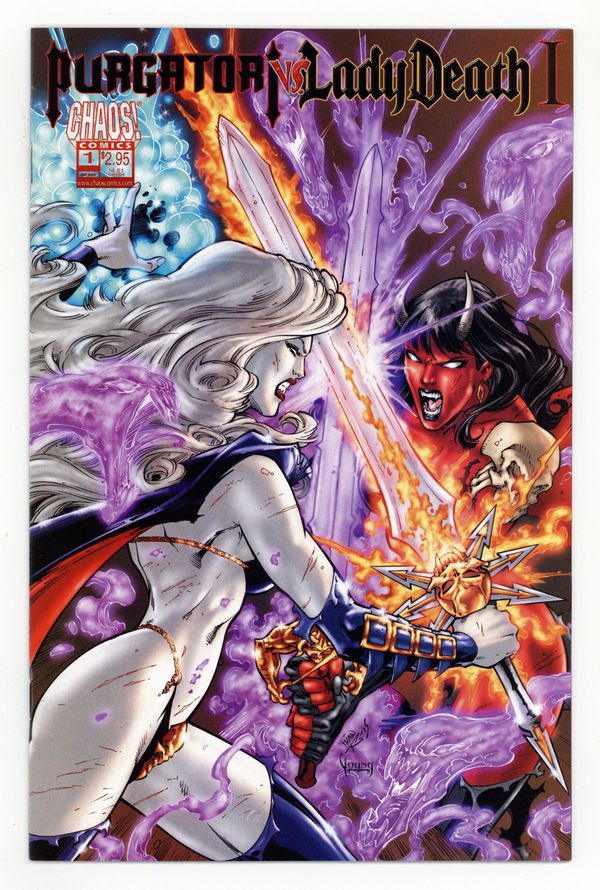 $15.00by Kaminsk; colored by Roy Young This is it ? the all-out, hair-pulling, cat-fighting rematch you've been lusting for! The Queen of the Dead versus the Queen of the Undead ? and this time, Purgatori has the home-court advantage! With Death himself forbidden to interfere by Fate, can Lady Death survive alone against the entire Scarlet Imperium ? not to mention the raging thirst for vengeance of its ruler? Cover by Ivan Reis and Roy Young. FC, 32pg Cover price $2.95.