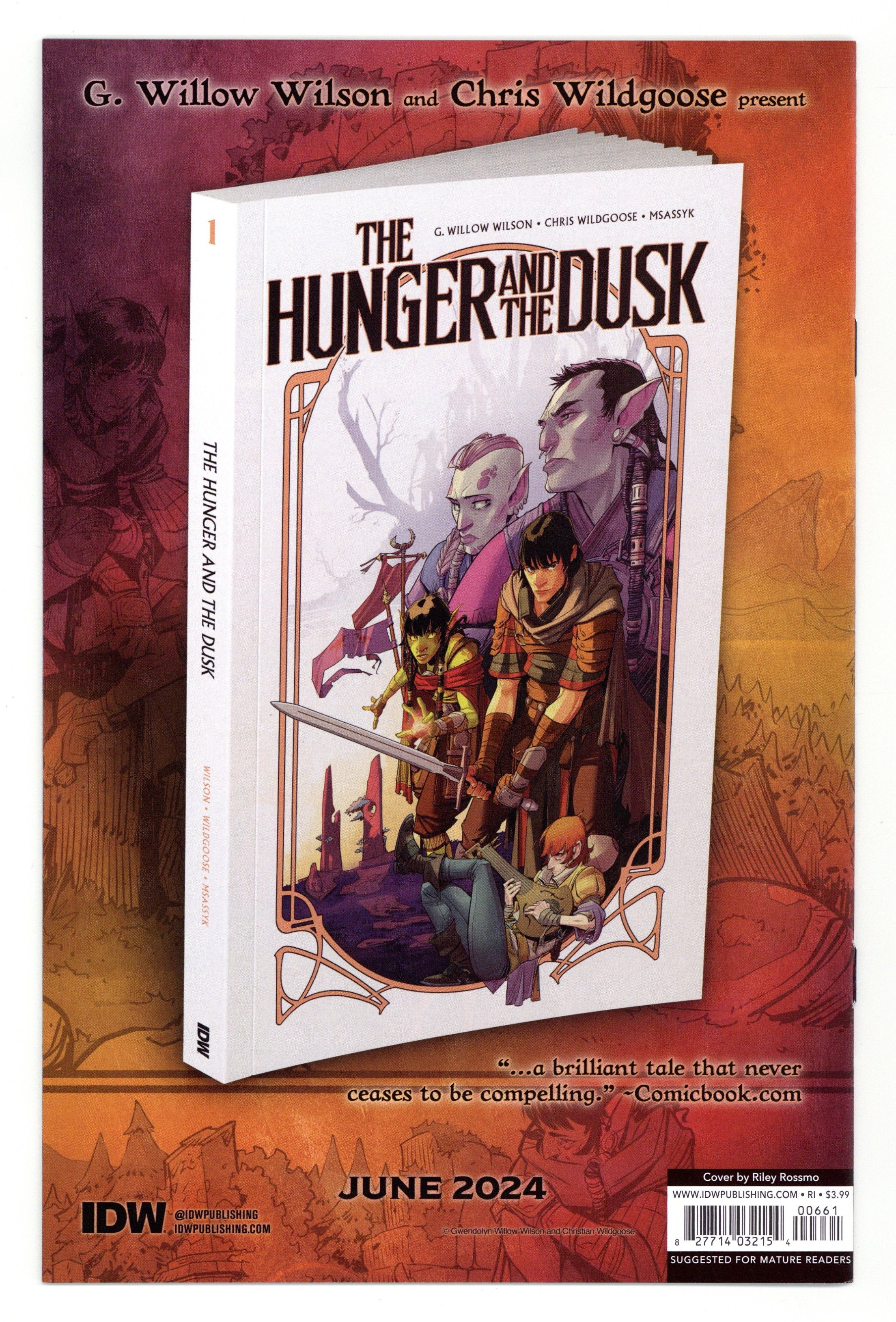 Published May 2024 by IDW Publishing.$14.00Limited 1 for 25 Retailer Incentive Variant Cover. Written by Patrick Horvath. Art by Patrick Horvath. Cover by Riley Rossmo. In Woodbrook's darkest days, many have diedThe townsfolk have trembled, shivered, and cried A horrific plan drives the fate of our bearAnd unspeakable actions will give quite a scareJoin us now, as we finally lift the veil As this, my friends, is the end of our tale 28 pages, full color. Rated M Cover price $3.99.