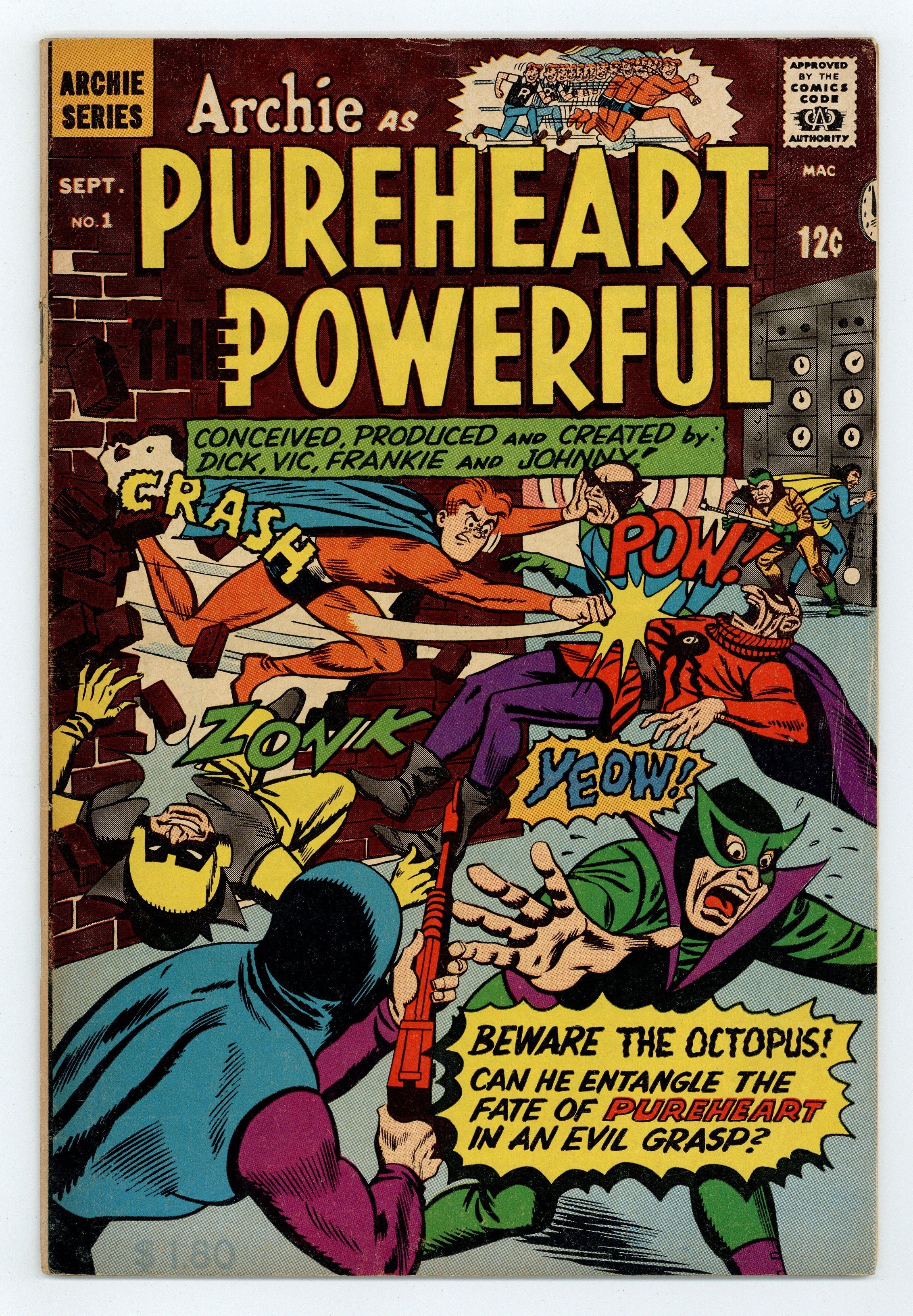 Cover pencils by Paul Reinman. Mite and Maim, script by Frank Doyle, pencils by Bob White; Pureheart the Powerful battles the Octopus. Drat That Hat with Sammy the Whamy humor page. Archie Annual 18 ad. Ptomaine Terror, script by Frank Doyle, pencils by Bob White Pureheart the Powerful battles Evilheart and Fang Finkster. 36 pgs. $0.12. Cover price $0.15.