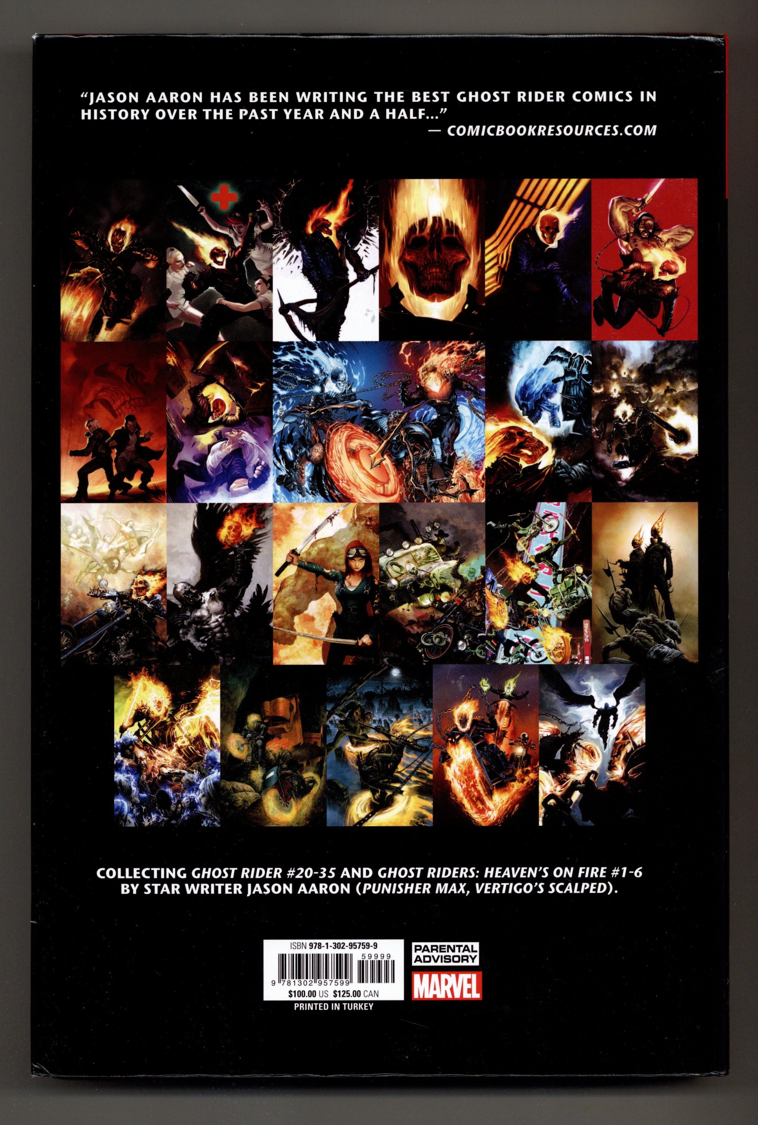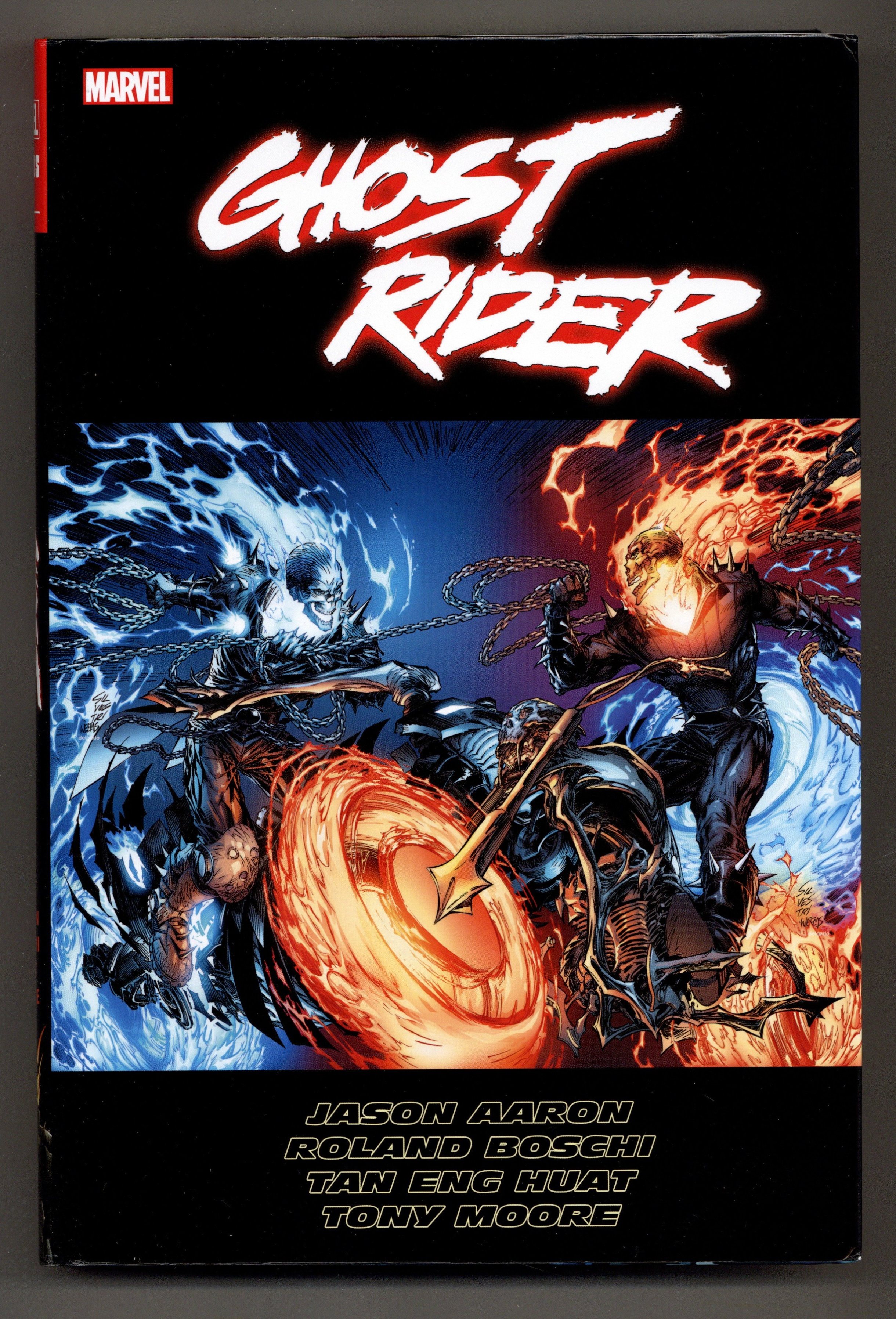 3rd Edition - 1st printing. Collects Ghost Rider (2006 4th Series) #20-35 and Ghost Riders: Heavens on Fire (2009) #1-6. Written by JASON AARON. Art by TONY MOORE, TAN ENG HUAT and ROLAND BOSCHI. Cover by MARC SILVESTRI. Superstar writer Jason Aaron's searing take on the Spirit of Vengeance finds Johnny Blaze facing off against the forces of Heaven itself in an epic saga that sends Ghost Rider down a blazing new road! When the rogue angel Zadkiel tries taking over the world's Ghost Riders -- that's right, there's more than one! -- Blaze and his flame-headed alter ego are in for the fight of their lives! Featuring the return of the OTHER Ghost Rider, Danny Ketch, in a team-up you never imagined and a showdown that had to happen! Strap in for a tale of insanity jam-packed with new villains, old allies and the same old grindhouse action that Flamehead fans have come to know and love! Hardcover, 7 1/2-in. x 11-in., 538 pages, full color. Parental Advisory Cover price $100.00.
