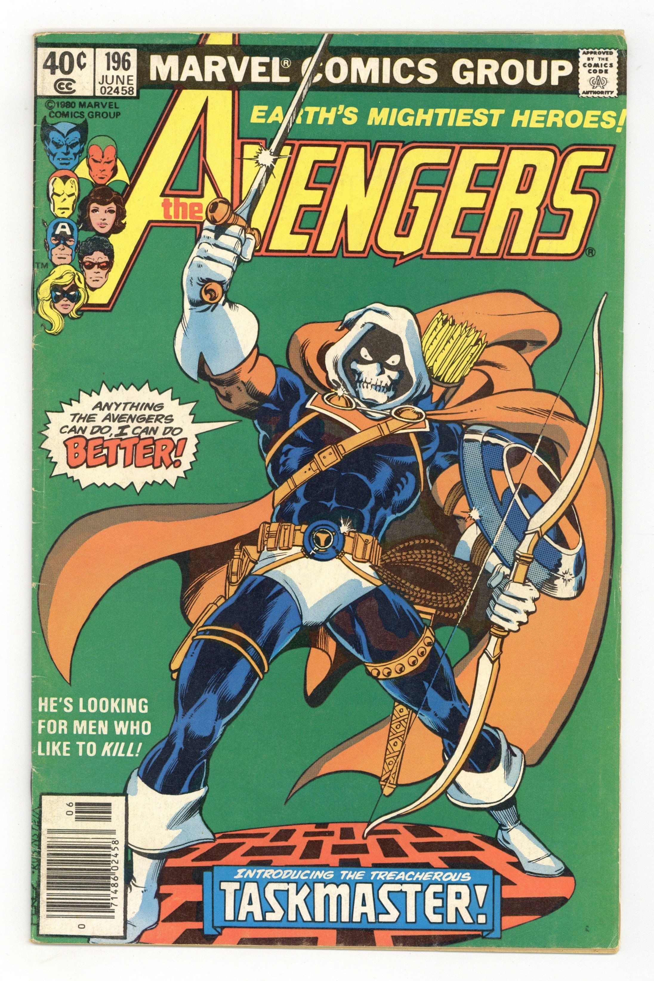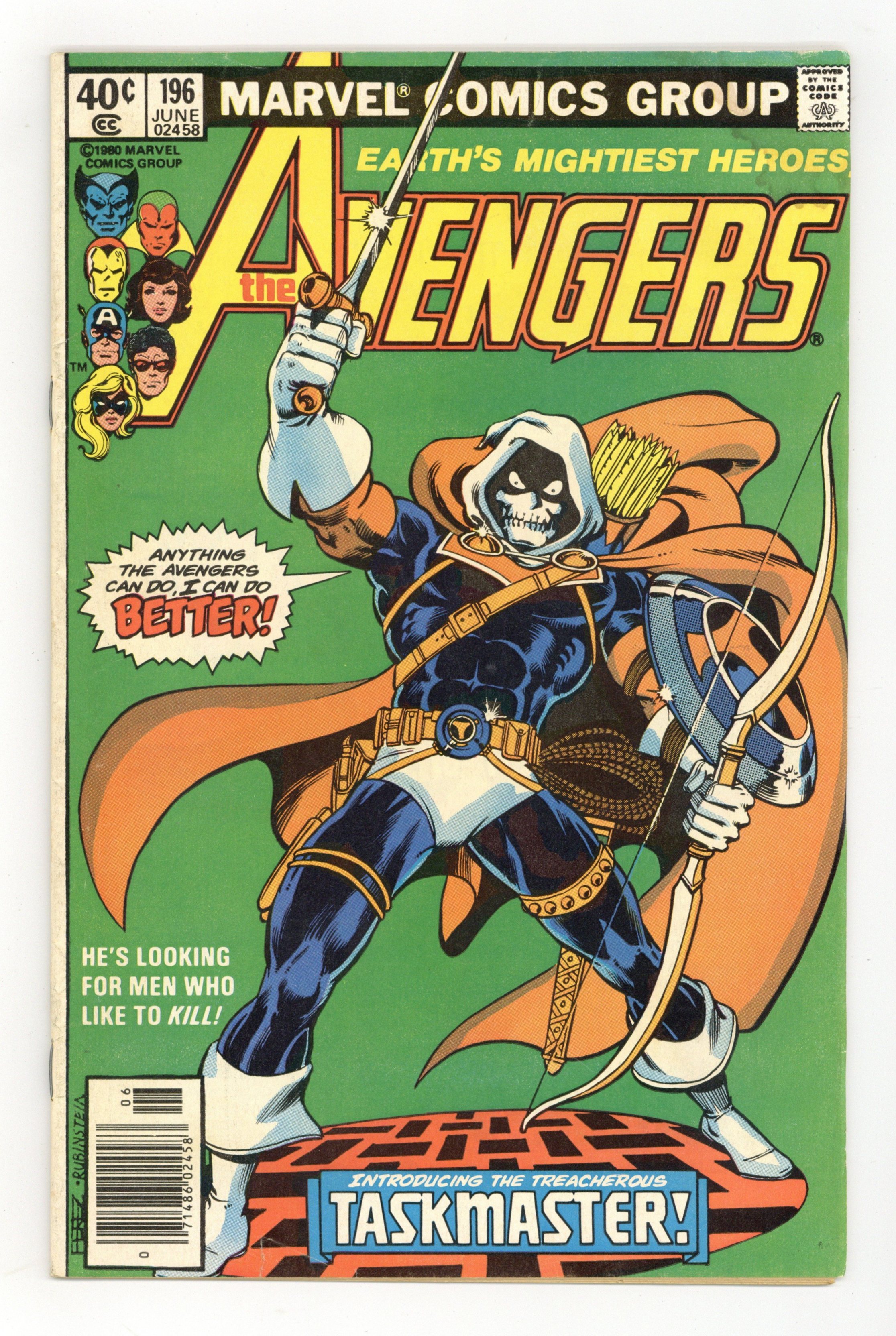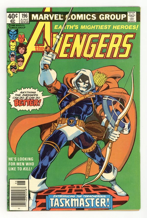 Newsstand Edition. "The Terrible Toll of the Taskmaster" Guest-starring Ant-Man. Script by David Michelinie. Pencils by George Perez. Inks by Jack Abel. Cover by George Perez and Joe Rubinstein. A brand new villain, the Taskmaster, has turned the tables on the Wasp, Yellowjacket, and Ant-Man! The three insect-like super-heroes are prisoners inside the Taskmaster's training academy! The good news is that seven avengers are waiting outside the training compound, but the bad news...none of them know that their teammates are in grave danger! However, Earth Mightiest Heroes follow the ants, and the trail leads to the Taskmaster! Is the villain with the photographic reflexes ready to battle the Avengers? Choose wisely dear Taskmaster! First (full) appearance and origin of the Taskmaster. (Notes: The Taskmaster appears next in Marvel Team-Up 103. The letters page includes a letter from comics writer Kurt Busiek.) 36 pages Cover price $0.40.