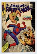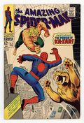 "The Coming of Ka-Zar!" Part 1 of 2. Guest-starring Ka-Zar. Script by Stan Lee. Pencils by John Romita and Don Heck. Inks by Mike Esposito (as Mickey Demeo). Cover by John Romita. The news is good and bad for the Amazing Spider-Man. First the good...the web-slinger helped defeat Doc Oc at the end of last issue. Next the bad...he still has amnesia! So the wondrous wall-crawler is swinging around Manhattan not knowing who he is or where he lives. What a quandary! Meanwhile, Lord Kevin Plunder (akaKa-Zar) arrives in New York City with Zabu. And the first person he bumps into is J. Jonah Jameson! True to form JJJ convinces Ka-Zar that Spider-Man is a menace! And the Lord of the Jungle sets out to bring the web-slinger to justice! When Ka-Zar finds the web-spinner...the rhubarb begins! Atfirst Spider-Man has the advantage, but then the big cat enters the fray! Will Zabu send the wall-crawler to a watery grave? Cameo appearances by Aunt May, Anna Watson, John Jameson, Captain Stacy, Gwen Stacy, and Harry Osborn. (Notes: This issue is the first meeting between Spider-Man and Ka-Zar. The letters page includes a letter from comics historian Peter Sanderson.) 36 pages. Cover price $0.12.