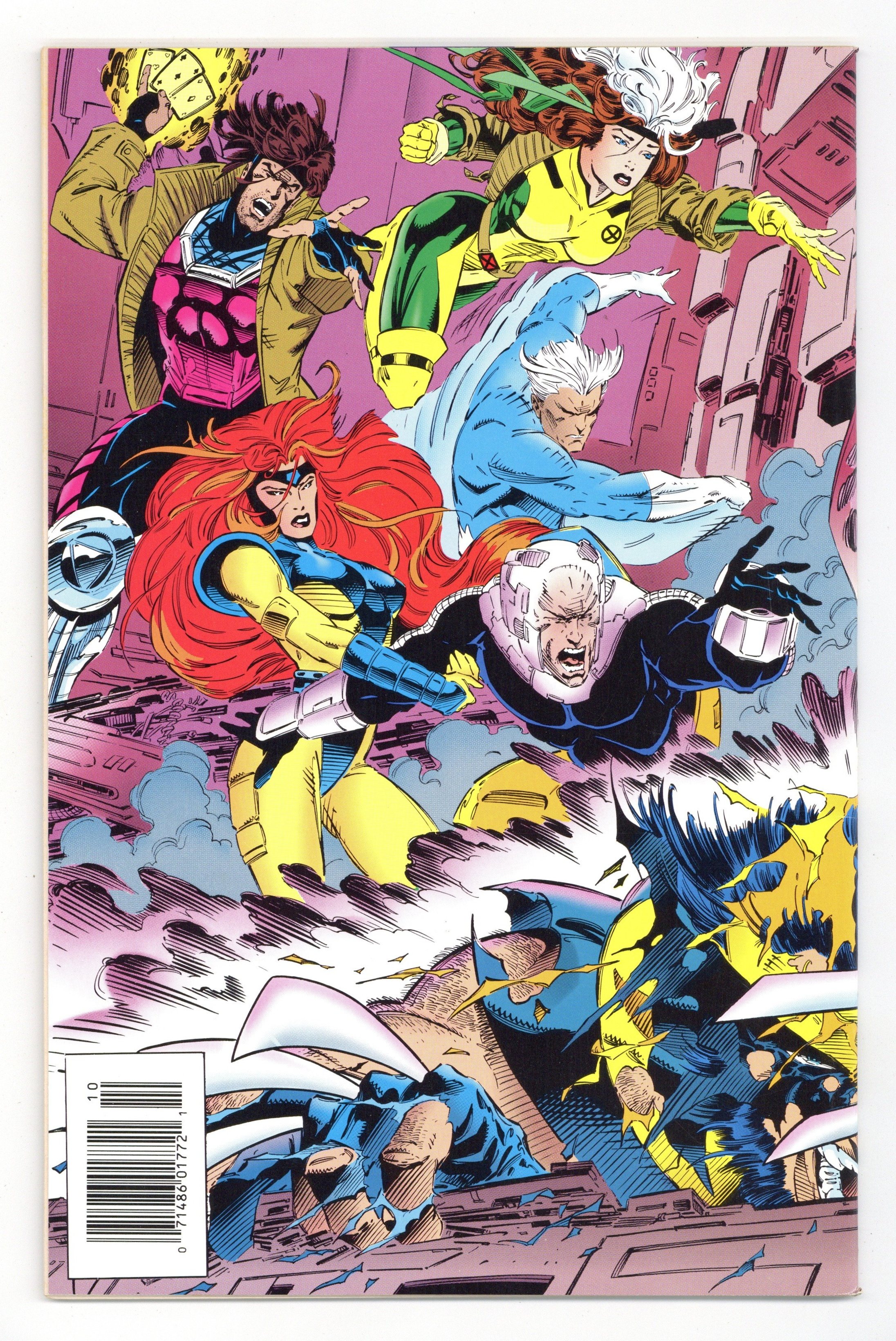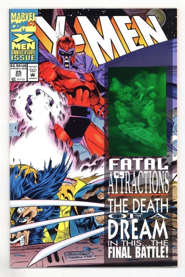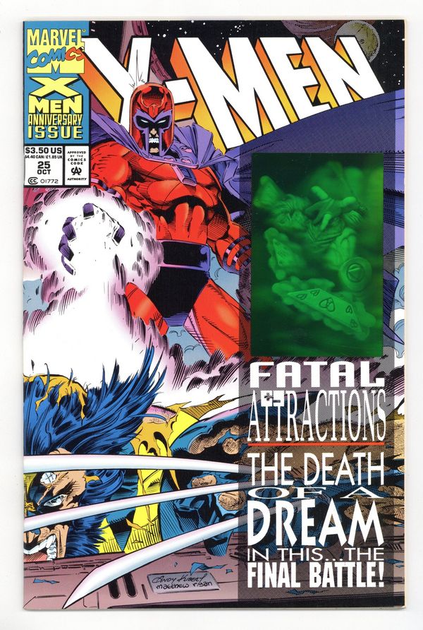 Newsstand Edition. Standard Gambit Hologram Cover by Andy Kubert. 48-page giant; Magneto pulls the adamantium out of Wolverine's body in this issue. Andy Kubert art. Fatal Attractions part 4 of 6: "Dreams Fade." Script by Fabian Nicieza, pencils by Andy Kubert, inks by Matthew Ryan. Cameos by the Thing and Mr. Fantastic (of the Fantastic Four) and Nick Fury. Kubert/Ryan wraparound cover. Cover price $3.50.