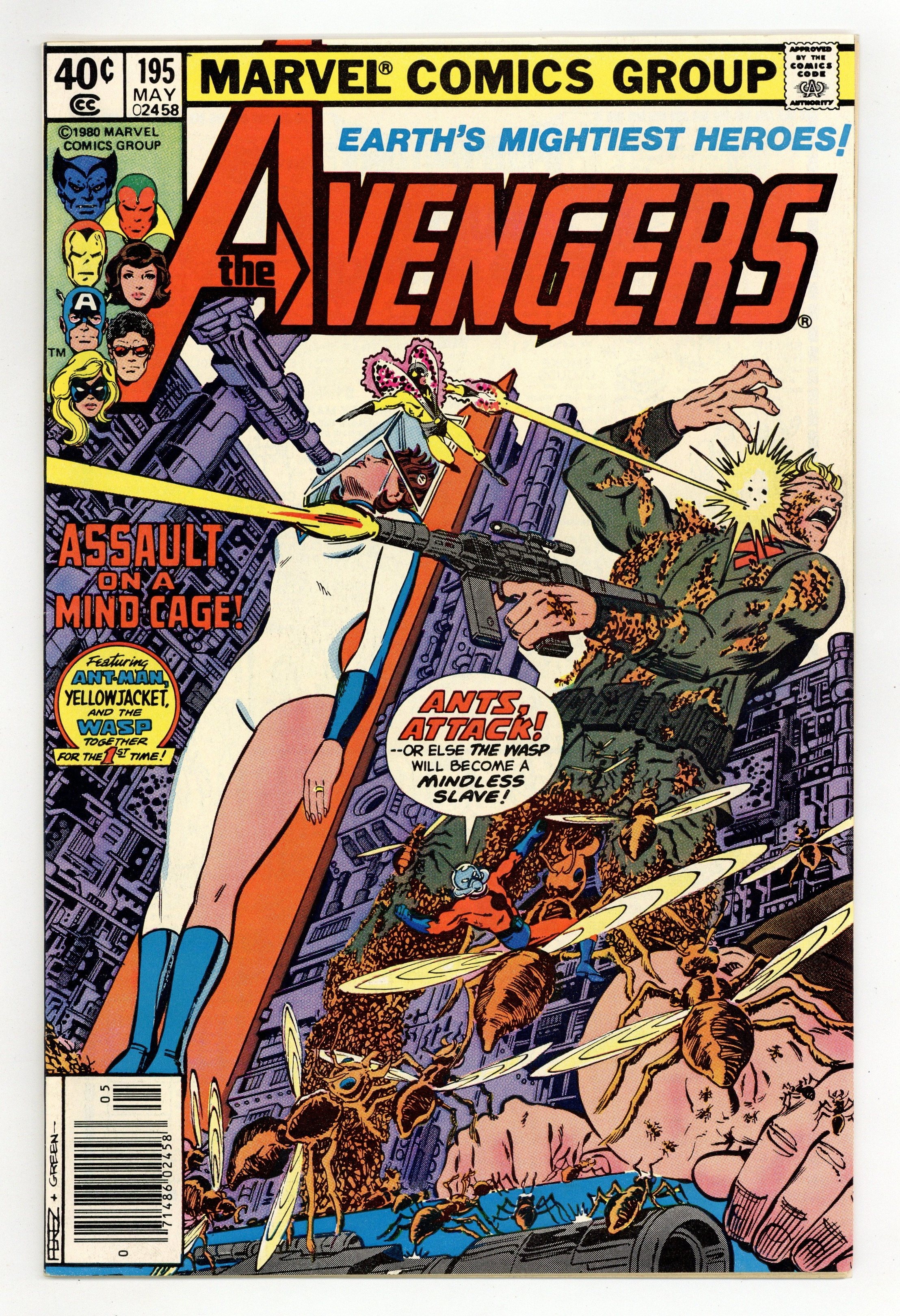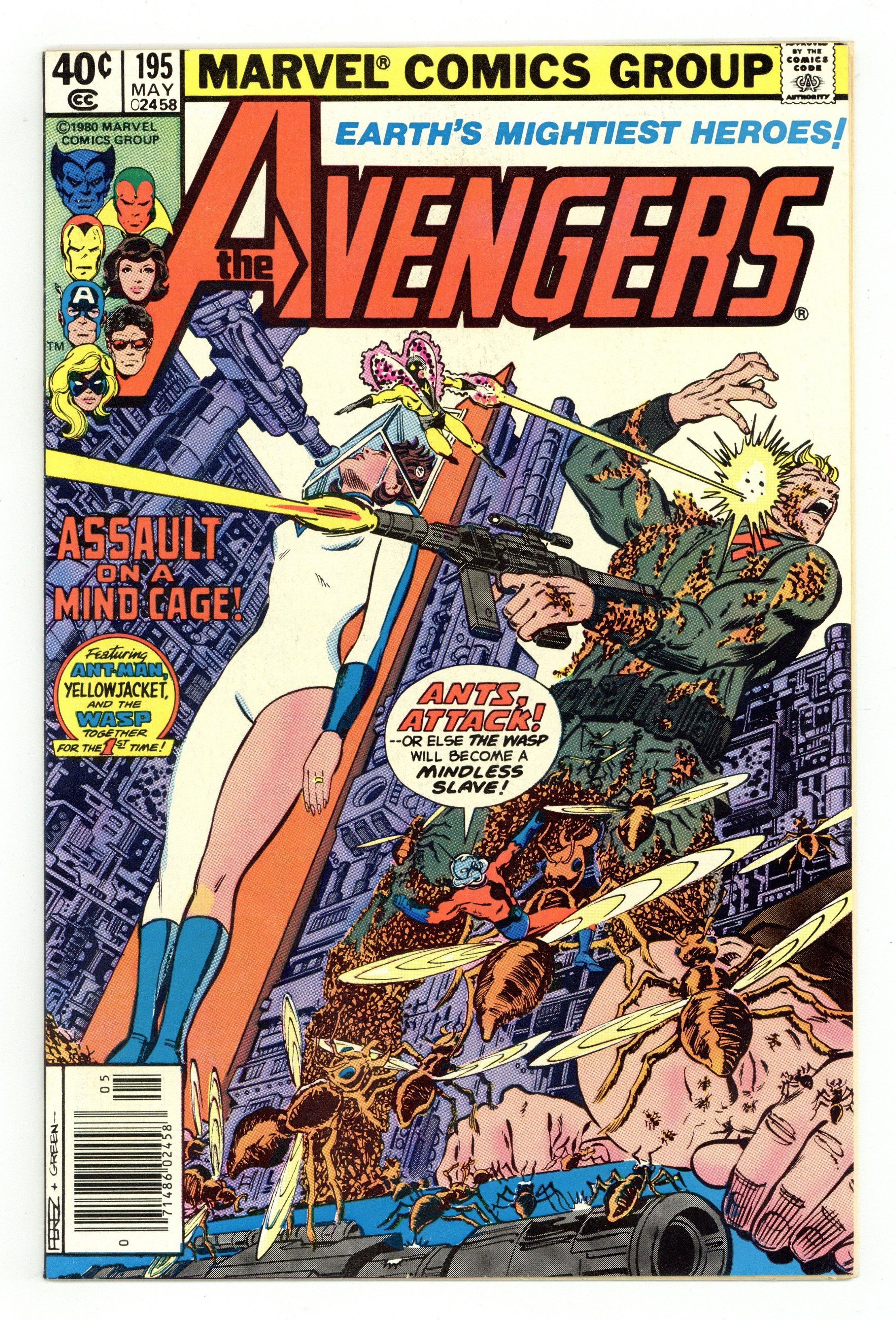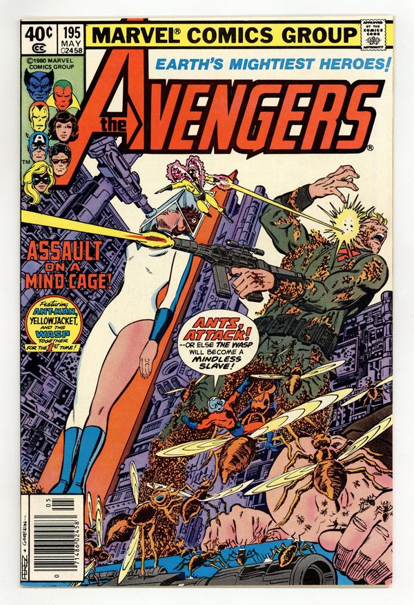 Newsstand Edition. "Assault on a Mind Cage!" Guest-starring Ant-Man. Script by David Michelinie. Pencils by George Perez. Inks by Jack Abel and Dan Green. Cover by George Perez and Dan Green. The Wasp has taken it upon herself to invade the Solomon Institute and find out what's going on inside! Unfortunately though, it's been several hours since anyone's heard from her! So Yellowjacket and Ant-Man (aka Scott Lang) infiltrate the institute, while the remaining avengers wait outside in the snow! The three insect-size heroes are having an easy time defeating all the guards in the asylum, but their fortunes dramatically change when the institute's head honcho arrives...the Taskmaster! First (cameo) appearance of the Taskmaster. Avengers Lineup: Beast, Captain America, Iron Man, Jocasta, Ms. Marvel, Vision, Wasp, Wonder Man, and Yellowjacket. 36 pages Cover price $0.40.