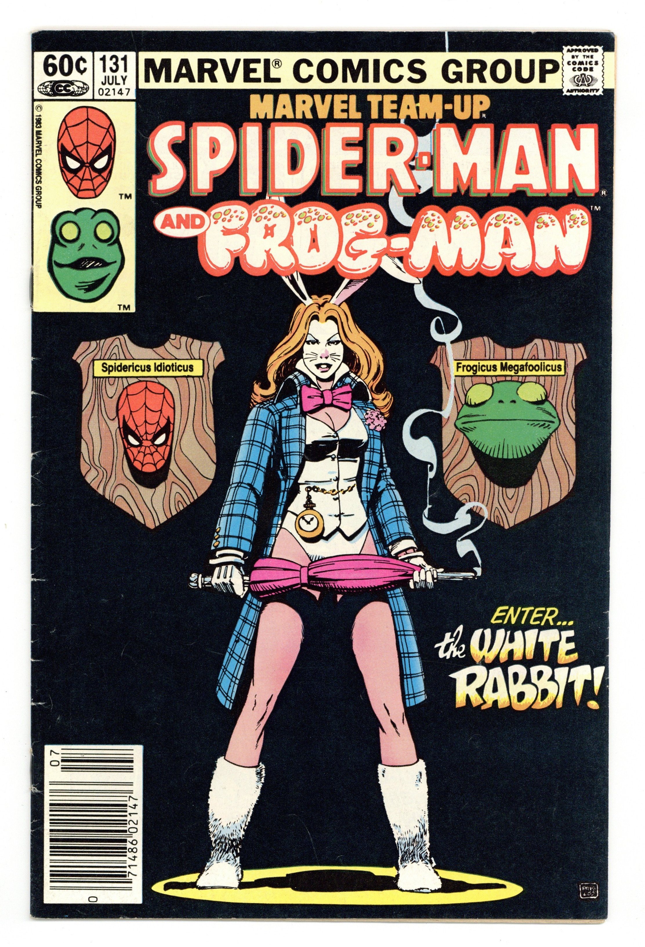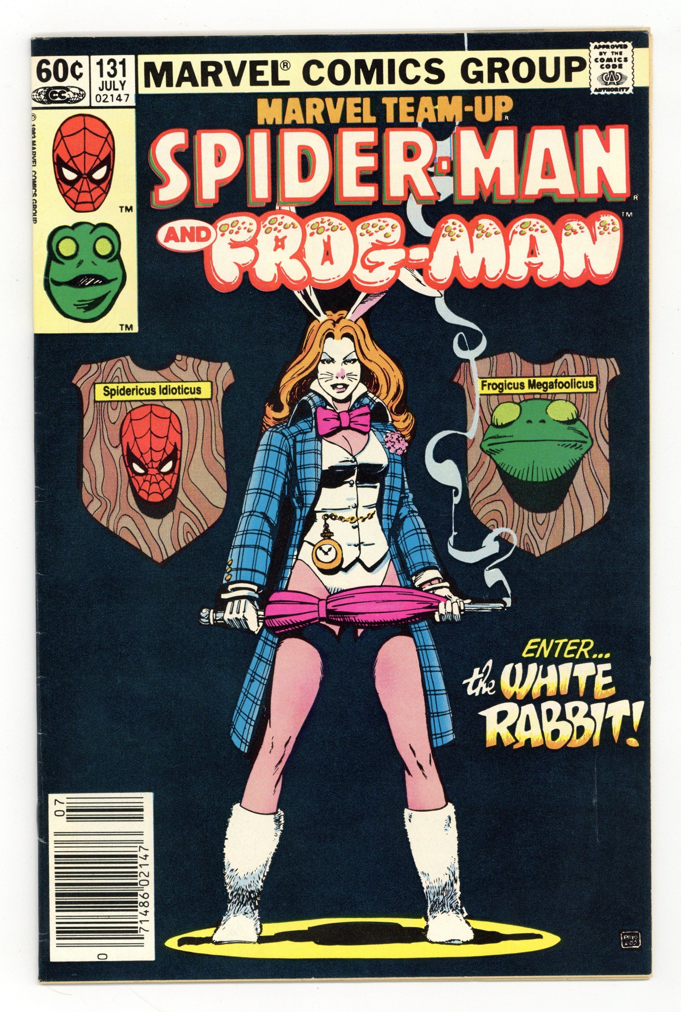 Newsstand Edition. "The Best Things In Life Are Free...But Everything Else Costs Money!". Guest-starring Spider-Man and Frog-Man. Script by J.M. DeMatteis. Pencils by Kerry Gammill. Inks by Mike Esposito. Cover by Paul Smith. Eugene Palilio had such a great time playing Frog-Man (in Marvel Team-Up 121) he decides that it's time for another adventure! When an opportunity presents itself during a restaurant robbery, Frog-Man springs into action! Predictably, Eugene gets in over his head against the White Rabbit, so the web-slinger swoops in to rescue his besieged friend! After another close life-and-death call, Eugene will probably wise up and retire...or will he? Not as long as the White Rabbit is on the loose! First appearance of the White Rabbit. Flashback cameo by Daredevil. 36 pages. Cover price $0.60.