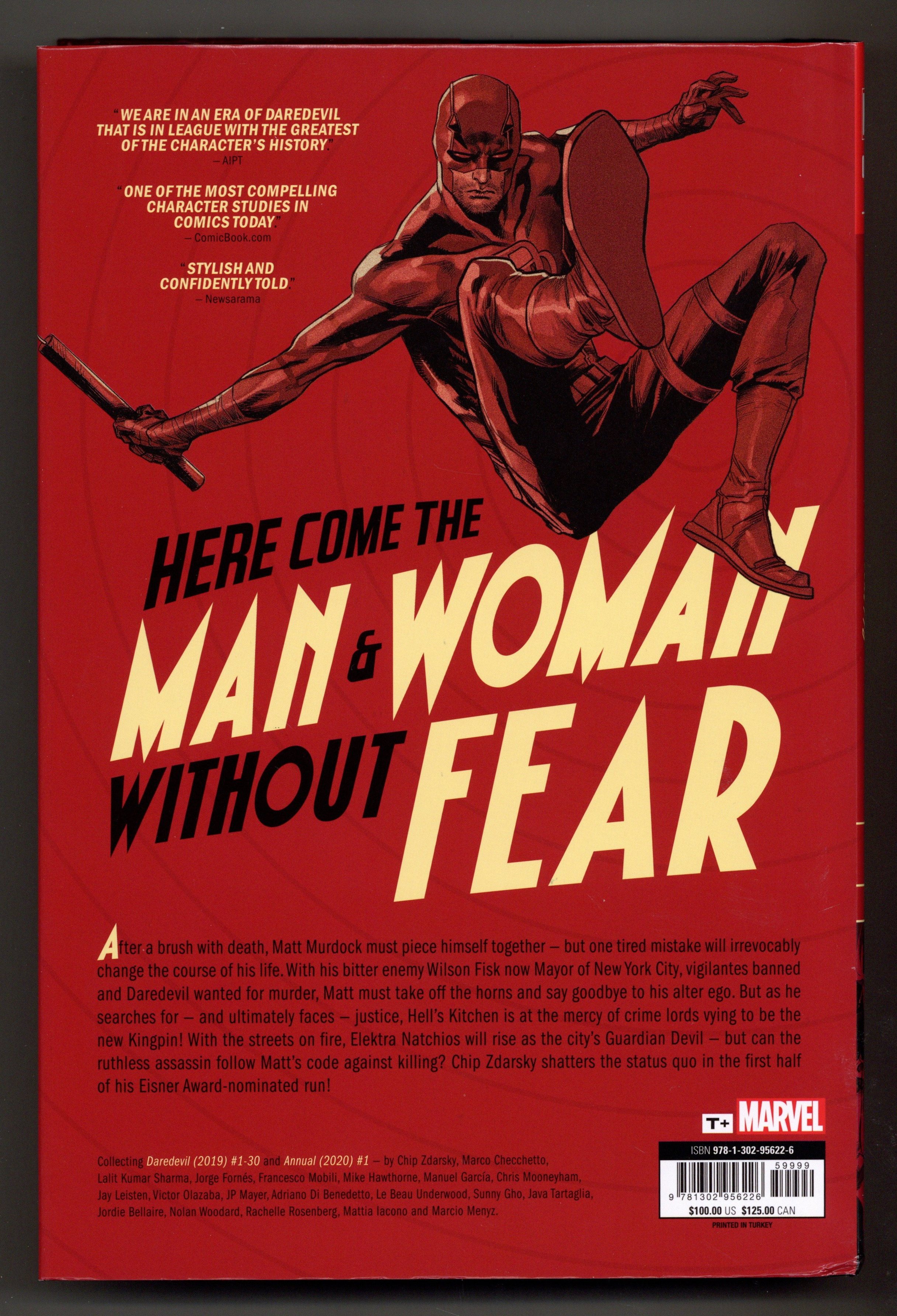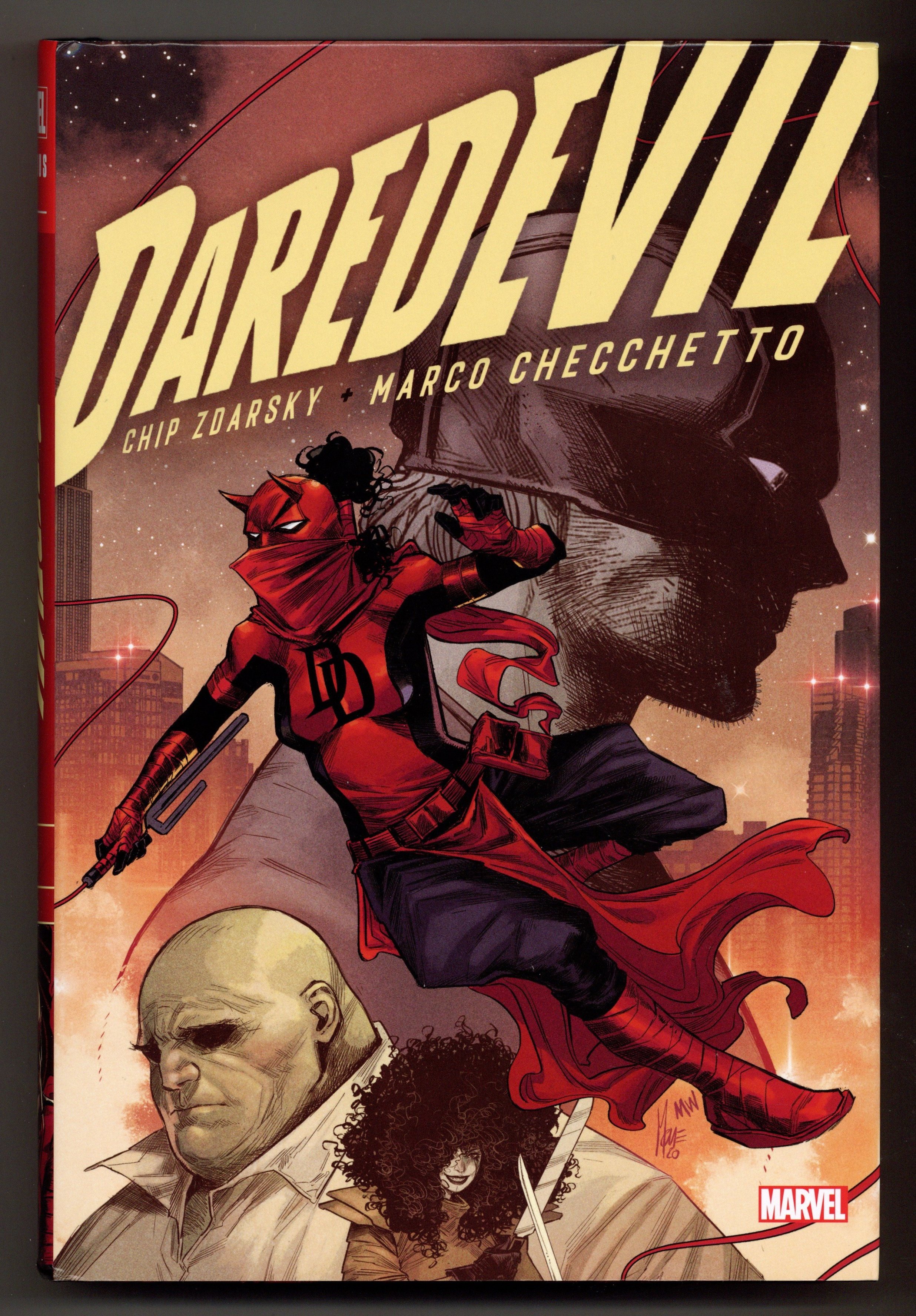 Volume 1 - 1st printing. Collects Daredevil (2019-2022 7th Series) #1-30 and Daredevil (2019-2022 7th Series) Annual #1. Written by Chip Zdarsky. Art by Marco Checchetto, Lalit Kumar Sharma, Jay Leisten, Jorge Fornes, Francesco Mobili, Manuel Garcia, Le Beau Underwood, Chris Mooneyham, Victor Olazaba, Mike Hawthorne, JP Mayer, and Adriano Di Benedetto. Cover by Marco Checchetto. After a dangerous brush with death, Matt Murdock must piece together his shattered life. Years of trauma have taken their toll, and becoming the guardian of Hell's Kitchen again won't be easy. Mistakes will be made - and one might prove to be the end of Daredevil! With a criminal dead, Matt must go on the run in a desperate bid to clear his name! Meanwhile, Mayor Wilson Fisk continues to make New York a dangerous place for vigilantes, the Owl turns his horrifying sights on Hell's Kitchen and a gang of lethal super villains runs riot. As Typhoid Mary and Bullseye return, DD makes a surprising stand...with a shocking outcome. Now Elektra must step up to fill the role Matt has vacated - and show that she is a woman without fear! Hardcover, 8 1/2-in. x 11-in., 704 pages, full color. Rated T+ Cover price $100.00.