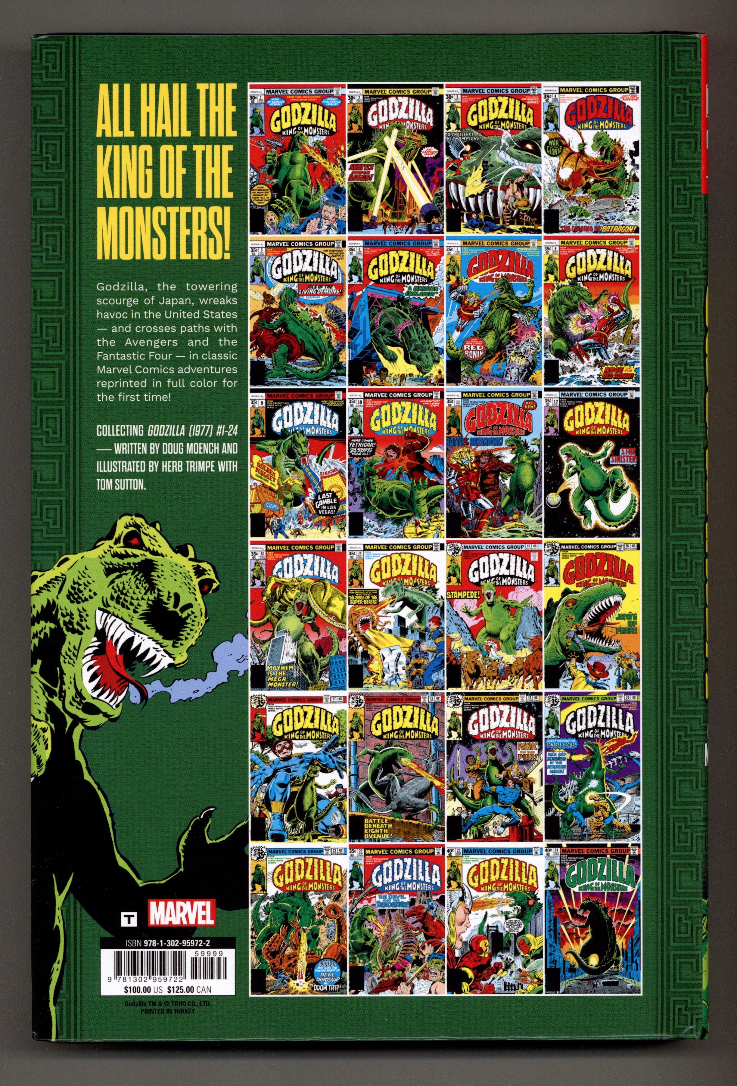 1st printing. Collects Godzilla (1977-1979 Marvel) #1-24. Written by Doug Moench. Art by Herb Trimpe, Tim Sutton, Jim Mooney, Tony DeZuniga, Klaus Janson, Fred Kida, Dan Green, Jack Abel, Frank Giacoia, and George Tuska. Cover by Herb Trimpe. Godzilla, the towering scourge of Tokyo, rises from the depths in the United States - and the Marvel Universe! For two glorious years in the 1970s, Japan's greatest export was one of Marvel's biggest stars - marching across America and battling some of the best and brightest the House of Ideas had to offer, including the Fantastic Four, the Avengers, the Champions, Nick Fury and the mechanized monster fighter, Red Ronin! Godzilla goes west, travels through time to battle Devil Dinosaur and hosts one of Spider-Man's most gratuitous guest-shots ever - but when Godzilla is shrunk down to miniature size, the terrible titan proves it can still be a tiny terror! Plus: Aliens, mutants, mad scientists and epic kaiju clashes with Godzilla's fellow towering titans - including Batragon and Yetrigar! Hardcover, 8 1/2-in. x 11-in., 440 pages, full color. Rated T Cover price $100.00.