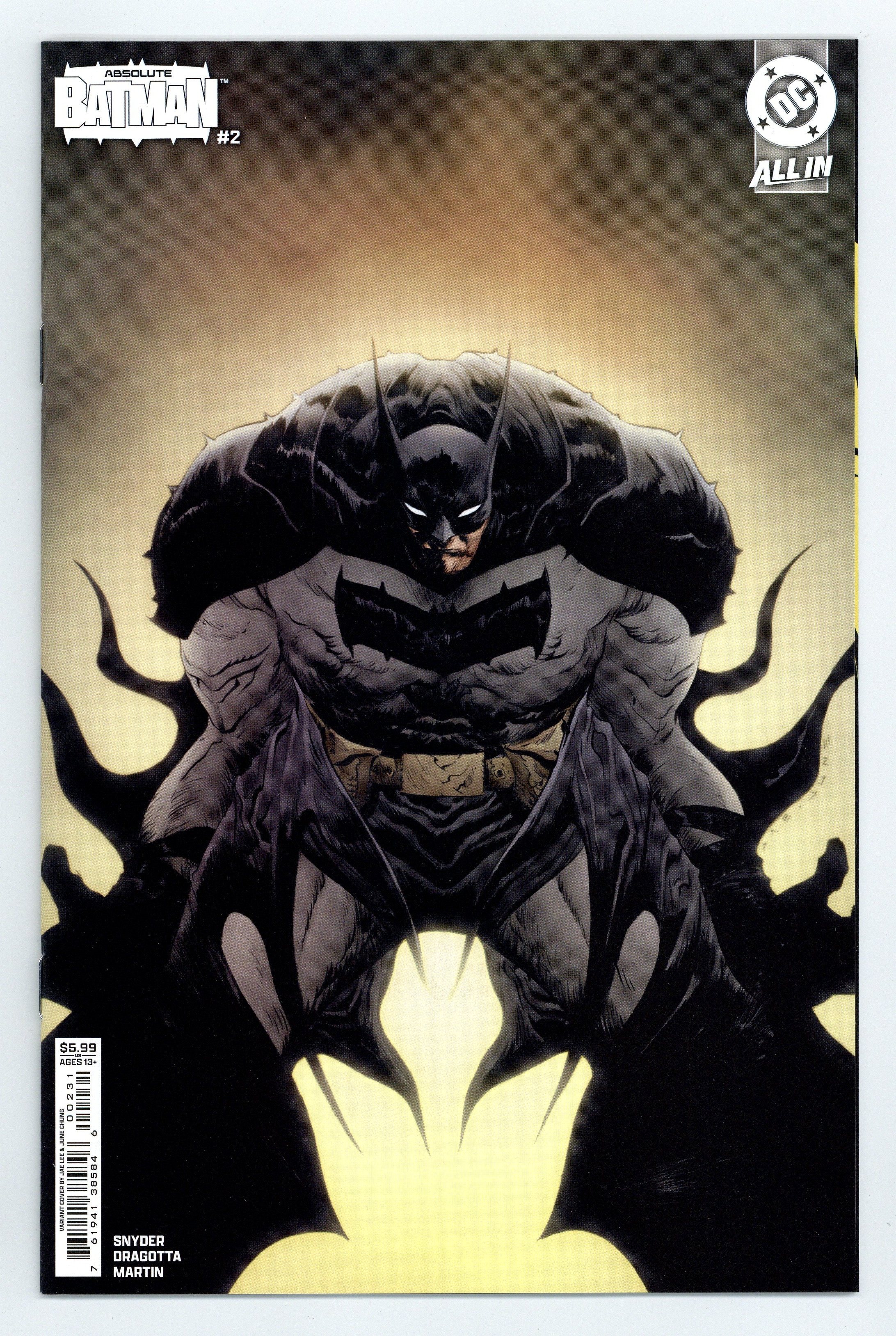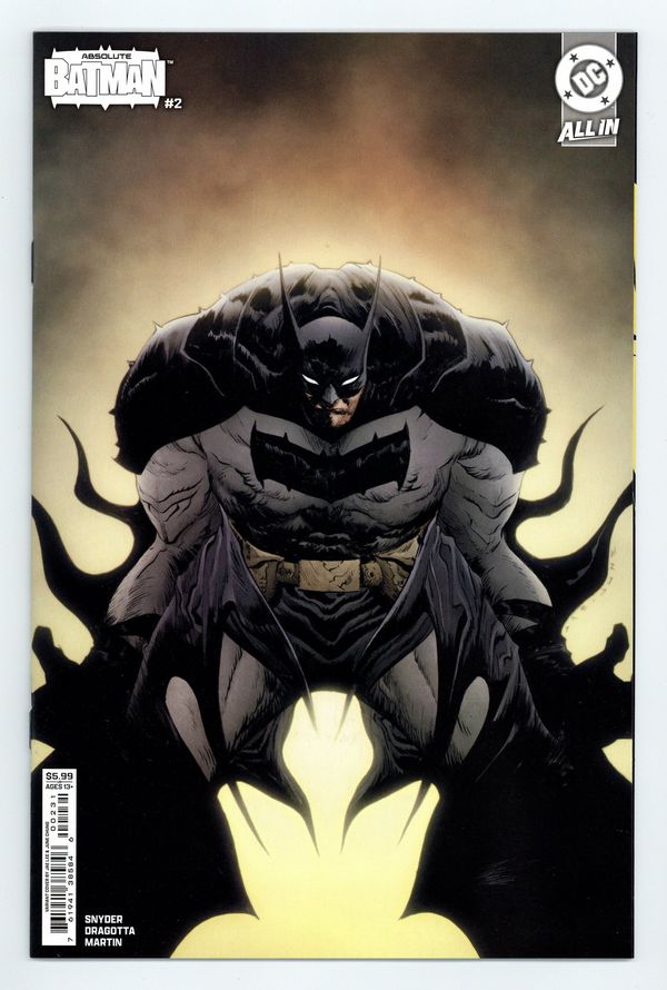 $26.50Written by Scott Snyder. Art by Nick Dragotta. Cover by Jae Lee & June Chung. SNYDER AND DRAGOTTA'S BRAND-NEW TAKE ON THE DARK KNIGHT RAMPAGES ON! Batman was born out of violence - a horrible tragedy that shaped the trajectory of his future. But when a vigilant MI6 agent starts tracking the lonely life of Bruce Wayne, he discovers the interconnectivity between a hero's shell life and the many layers of the Black Mask Gang. It's Batman versus Alfred Pennyworth! 32 pages, full color. Rated T+ Cover price $5.99.