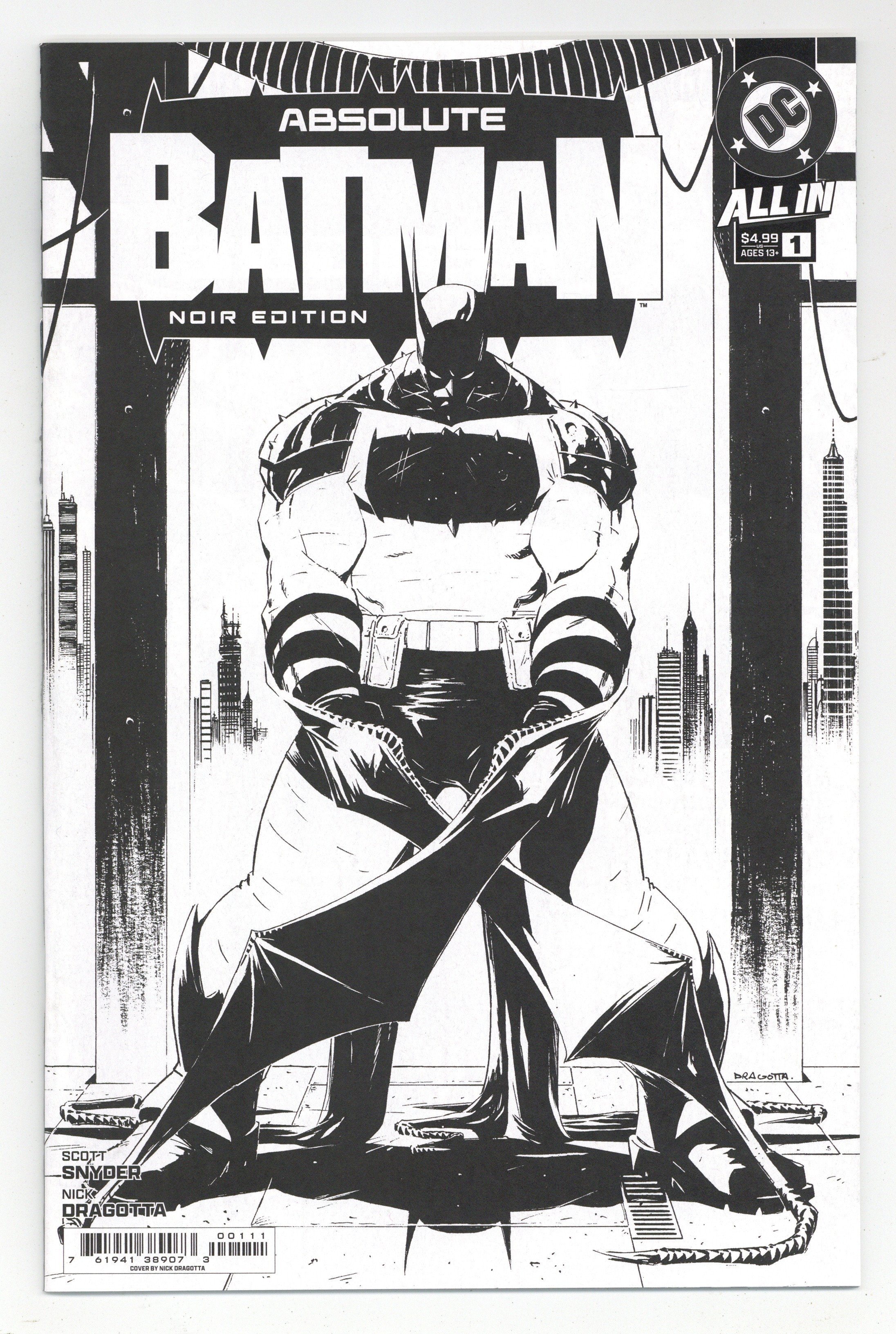 $25.00Written by Scott Snyder. Art and Cover by Nick Dragotta. BATMAN LEGEND SCOTT SNYDER AND ICONIC ARTIST NICK DRAGOTTA TRANSFORM THE DARK KNIGHT'S TALE FOR THE MODERN AGE! Without the mansion...without the money...without the butler...what's left is the Absolute Dark Knight! 44 pages, full B&W. Rated T+ Cover price $4.99.