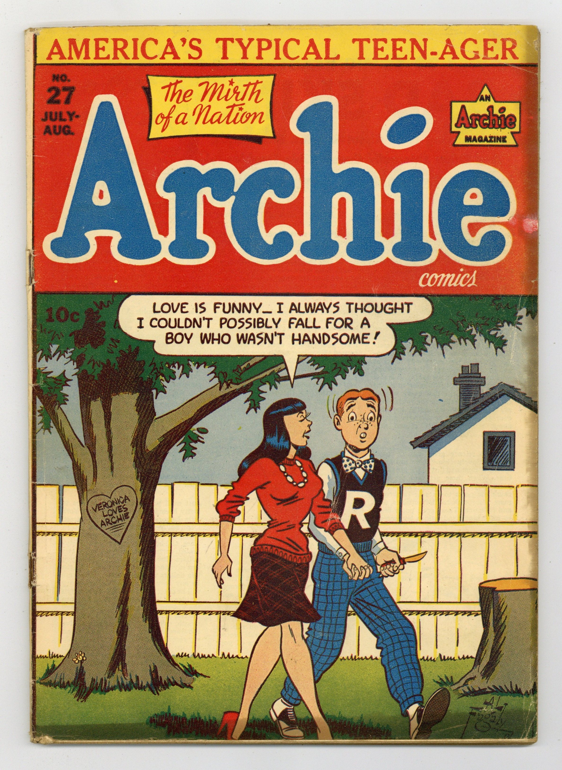 Cover by Al Fagaly. Stories by unknown. Art by Bill Vigoda, Irving Novick and unknown. Archie heads to the gym to bulk up after he makes plans to go to the beach with Veronica and her muscular cousin in "Musclebound Madness"! Plus: Archie gets stuck babysitting Veronica's triplet cousins in "Three's a Crowd"; Archie brings a mouse to school, with the expected results; a dog gets in the way of Archie's entries in the newspaper beauty contest in "Photo-Finish"; Betty and Veronica go to the beach and fight over men; and Archie tries to water the lawn in "Water, Water, Everywhere"! Also: Archie (Hollywood report) celebrity news and gossip, including a piece about Ronald Reagan's marriage to Jane Wyman, in the 2-page "Hollywood Tattle Tale"! And: "Archie Puzzle Page" (two of them)! 48 pages, full color. Cover price $0.10.