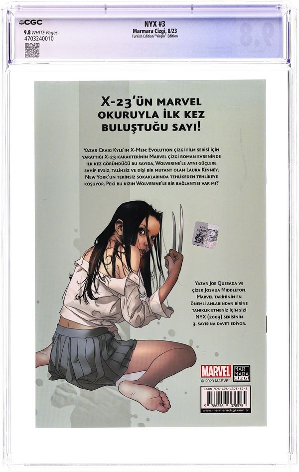 Turkish Edition. Virgin Cover by Joshua Middleton. Story by Joe Quesada. Art by Joshua Middleton. Reprints NYX (2003) #3. Distributed with sticker on back cover. Turkish Language.