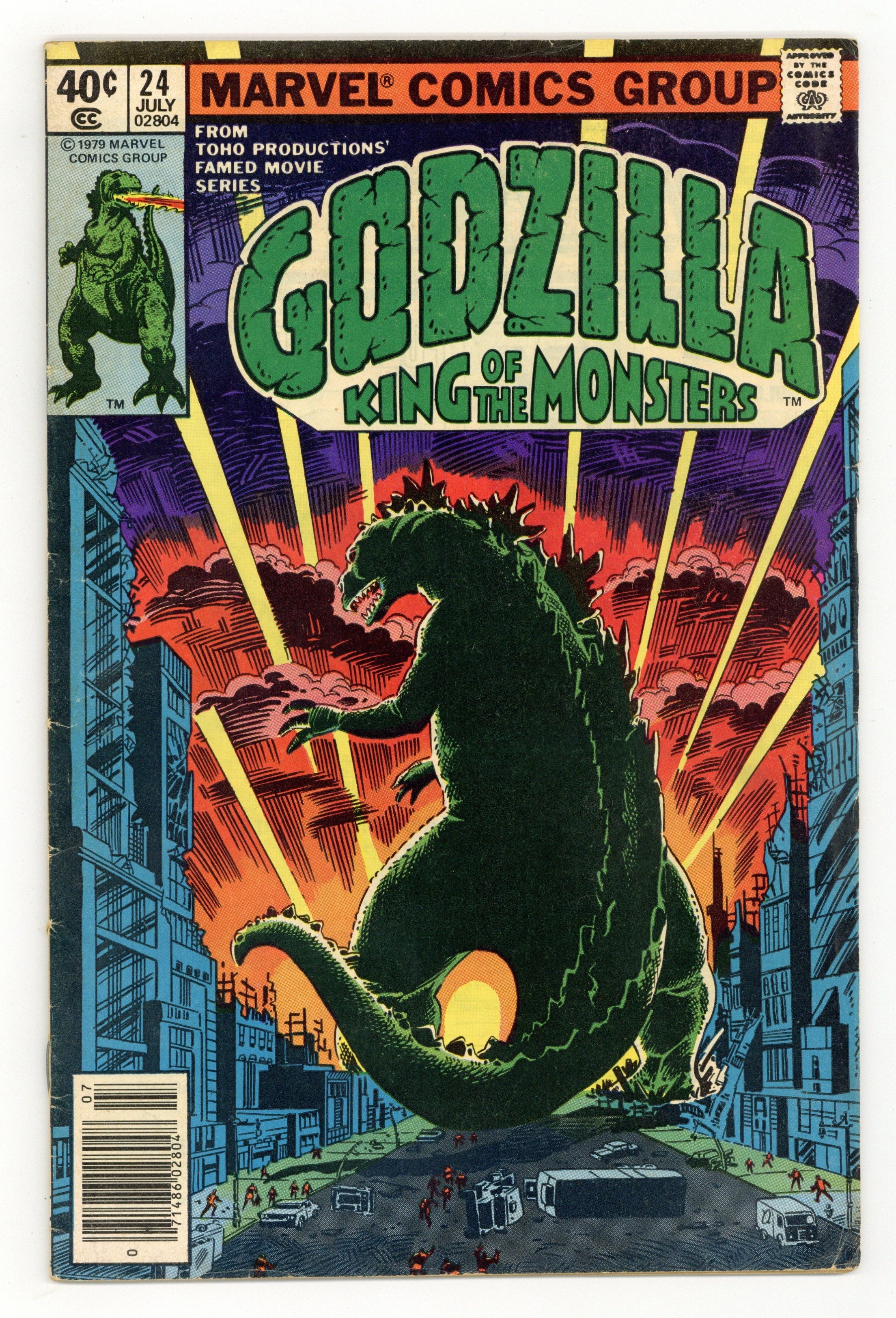 Newsstand Edition. Final issue. "And Lo, A Child Shall Lead Them!" Part 8 of 8. Guest-starring the Avengers and Fantastic Four. Spider-Man cameo. Story by Doug Moench. Art by Herb Trimpe and Dan Green. Godzilla's epic American Tour comes to an earth shattering end. Can the combined might of the Avengers, Fantastic Four, and S.H.I.E.L.D. hope to contain this titanic beast before he destroys the Big Apple, or will they have to finally use lethal force to bring the beast down? This is it, the final farewell for Godzilla, King of the Monsters. Cover price $0.40.