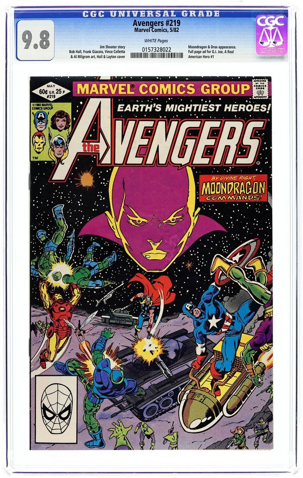 Direct Edition. "By Divine Right!" Part 1 of 2. Guest-starring Drax the Destroyer. Script by Jim Shooter. Pencils by Bob Hall. Inks by Embellishers Assembled. Cover by Bob Hall and Bob Layton. Captain America, Iron Man, Thor, and the Wasp are all going about their daily business when suddenly a psychic bolt from the blue strikes them! Who is summoning the four avengers? Why it's the erstwhile avenger Moondragon! Apparently the Titan priestess needs helps in suppressing a rebellion on her adopted home planet of Ba-Bani. But Moondragon's father, Drax the Destroyer, is already there. How come Drax, one of the most powerful beings in the universe, cannot squash the rebellion? Is something rotten in the state of Ba-Bani? The Avengers think so! (Notes: Moondragon and Drax the Destroyer previously appeared in Thor 314 and Marvel Graphic Novel 1. This issue features a full-page ad for G.I. Joe 1.) 36 pages Cover price $0.60.