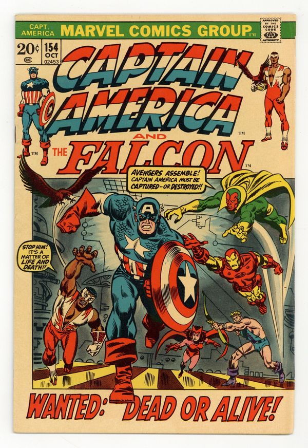 First (full) appearance of Jack Monroe (as Bucky) in "The Falcon Fights Alone!" Part 2 of 4. Script by Steve Englehart. Pencils by Sal Buscema. Inks by John Verpoorten. Cover by Sal Buscema and Frank Giacoia. Captain America and Bucky are back! But how is this possible? That's what the Falcon is wondering as he trades blows with the costumed pair on the streets of Harlem. Eventually, the Falcon falls in battle, but the local residents drive off his red, white, and blue attackers. After catching his breath, Sam Wilson rushes to Avengers Mansion to find transportation to the Bahamas -- in order to warn his partner. But the Falcon is too late! The new Cap and Bucky are already on their way south to waylay the star-spangled avenger! Cameo appearances by Steve Rogers, Sharon Carter, Leila Taylor, Brian Muldoon, Jarvis, Hawkeye, Iron Man, Scarlet Witch, and the Vision. 36 pages. Cover price $0.20.