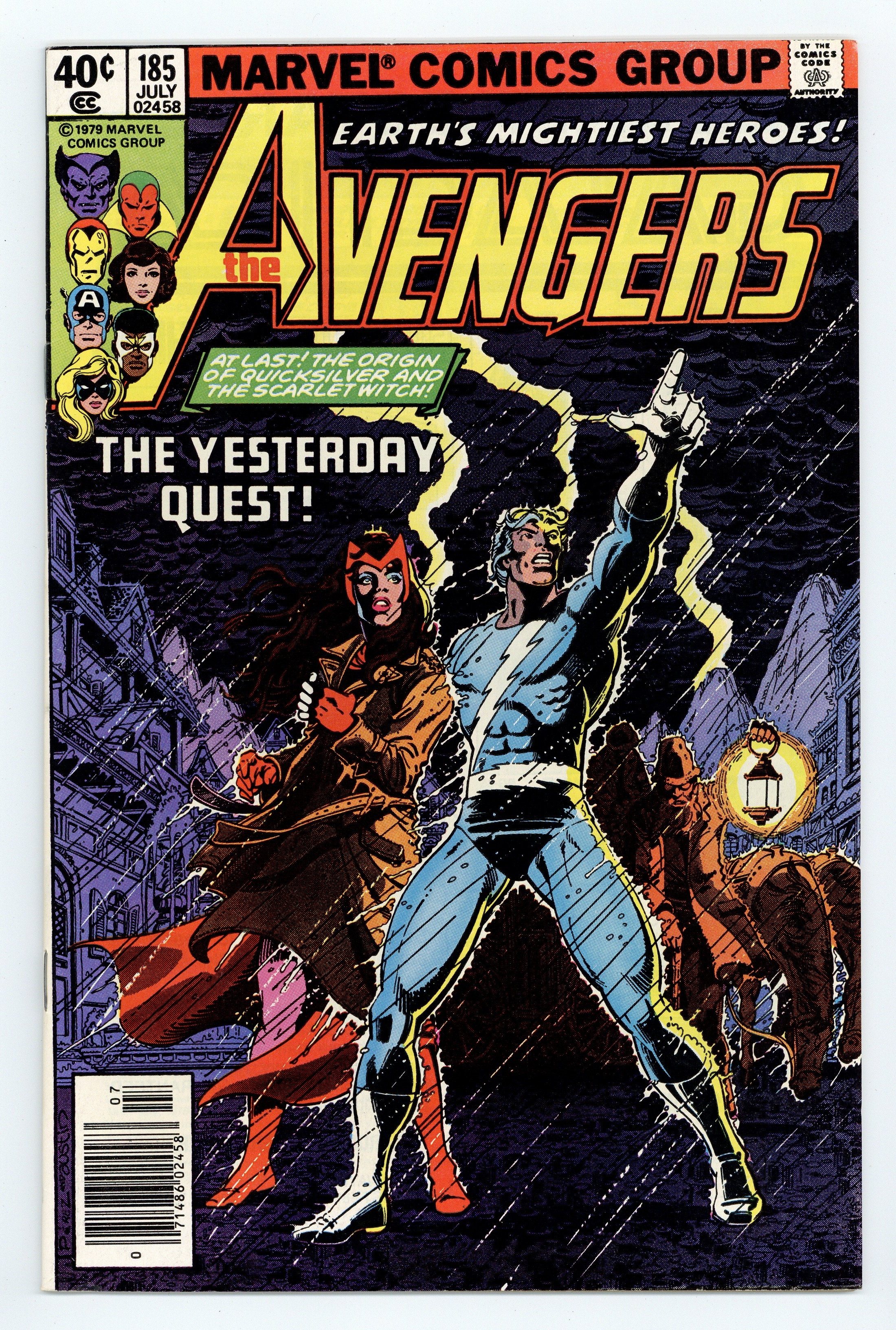 Tags: Avengers$11.50Newsstand Edition. "The Yesterday Quest!" Part 1 of 3. Plot by Mark Gruenwald and Steven Grant. Script by David Michelinie. Pencils by John Byrne. Inks by Dan Green. Cover by George Perez and Terry Austin. Ever since their first appearance in Uncanny X-Men 4 many years ago, the origin of Quicksilver and the Scarlet Witch has been a mystery to both comic readers and the siblings alike. After Wanda and Pietro arrive in Transia with Django Maximoff, clues to the twins' birthplace and birth parents begin to emerge. Modred the Mystic, the Darkhold, Bova the cow-woman, the High Evolutionary's former citadel, and Wundagore Mountain are all pieces to the puzzle. And the truth seems to lie at the top of the mountain. But there's something else at the top of Wundagore Mountain. Something ancient, something evil. Cameo appearance by Bova. Flashback cameos by Robert Frank, Madeline Frank, and the Toad. Avengers Lineup: Beast, Captain America, Falcon, Hawkeye, Iron Man, Jocasta, Ms. Marvel, Quicksilver, Scarlet Witch, Vision, and the Wasp. (Notes: Mark Gruenwald's participation in this three-part story was an indication of the storyline's importance to the continuity of the Marvel Universe. Modred previously appeared in Marvel Two-in-One 33. This issue includes a full-page ad for the Man-Thing's guest appearance in Micronauts 7.) 36 pages Cover price $0.40.