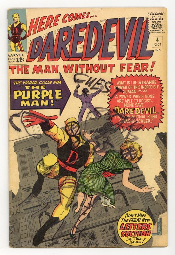 Cover pencils by Jack Kirby, inks by Vince Colletta. First appearance of the Purple Man in Killgrave, the Unbelievable Purple Man!, script by Stan Lee, pencils by Joe Orlando, inks by Vince Colletta; DD runs up against a purple man who can make anyone do what he wants just by suggesting it. First letters page. 36 pgs. Cover price $0.12. Cover price $0.12.