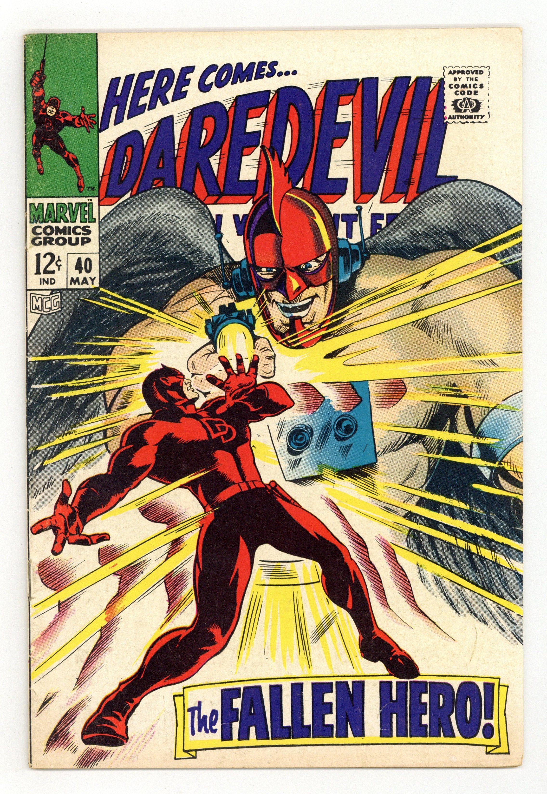 Tags: Marvel Legacy Numbering: Daredevil (part 40), Daredevil$15.75Cover pencils by Gene Colan, inks by John Tartaglione. The Fallen Hero, script by Stan Lee, pencils by Gene Colan, inks by John Tartaglione; Throwing down with the Unholy Three, Daredevil is zapped with the Exterminator's time displacement gun and zapped into limbo, possibly for eternity (or at least until next issue). Letter to the editor from comics writer Mark Gruenwald. 36 pgs. Cover price $0.12. Cover price $0.12.