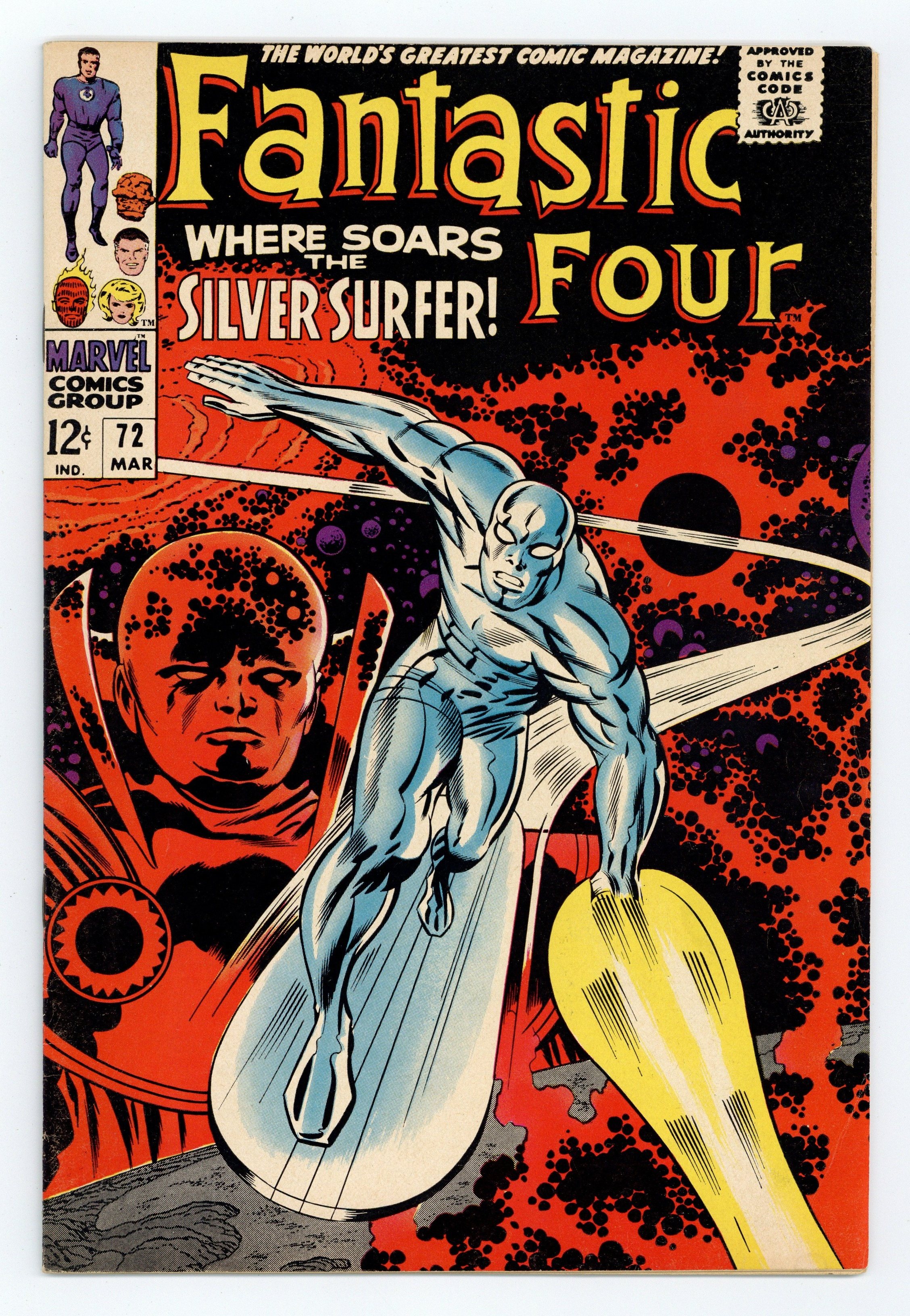 Starts Mar 2 Cover pencils by Jack Kirby, inks by Joe Sinnott. Where Soars the Silver Surfer!, script by Stan Lee and Jack Kirby (co-plot), pencils by Jack Kirby, inks by Joe Sinnott; The Fantastic Four battles the Silver Surfer. Watcher and Crystal (of the Inhumans) guest appearances. House ad for Thor #149 and Amazing Spider-Man #58. 36 pgs. $0.12. Cover price $0.12.