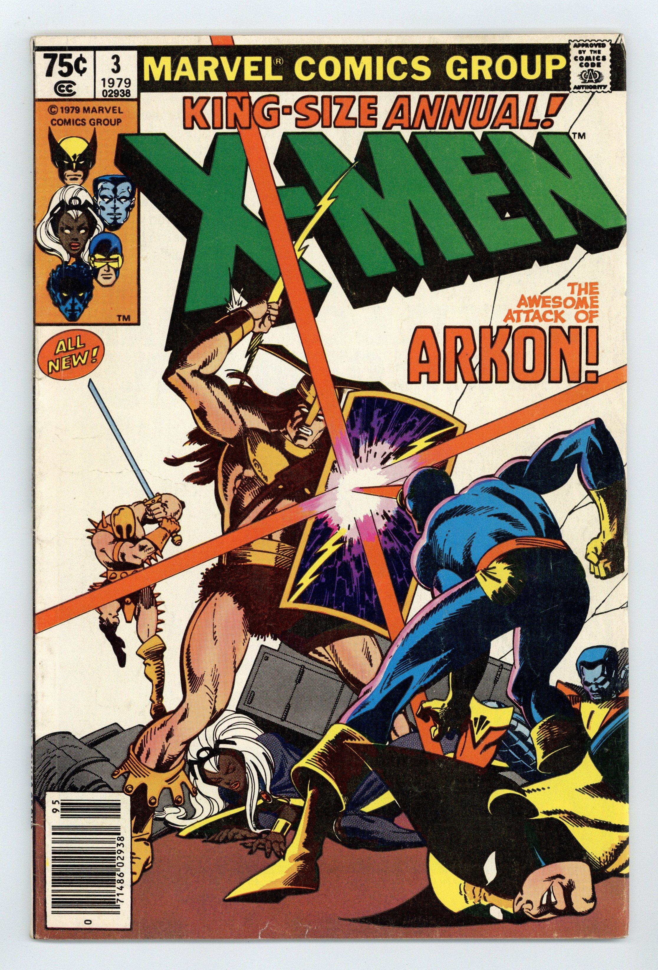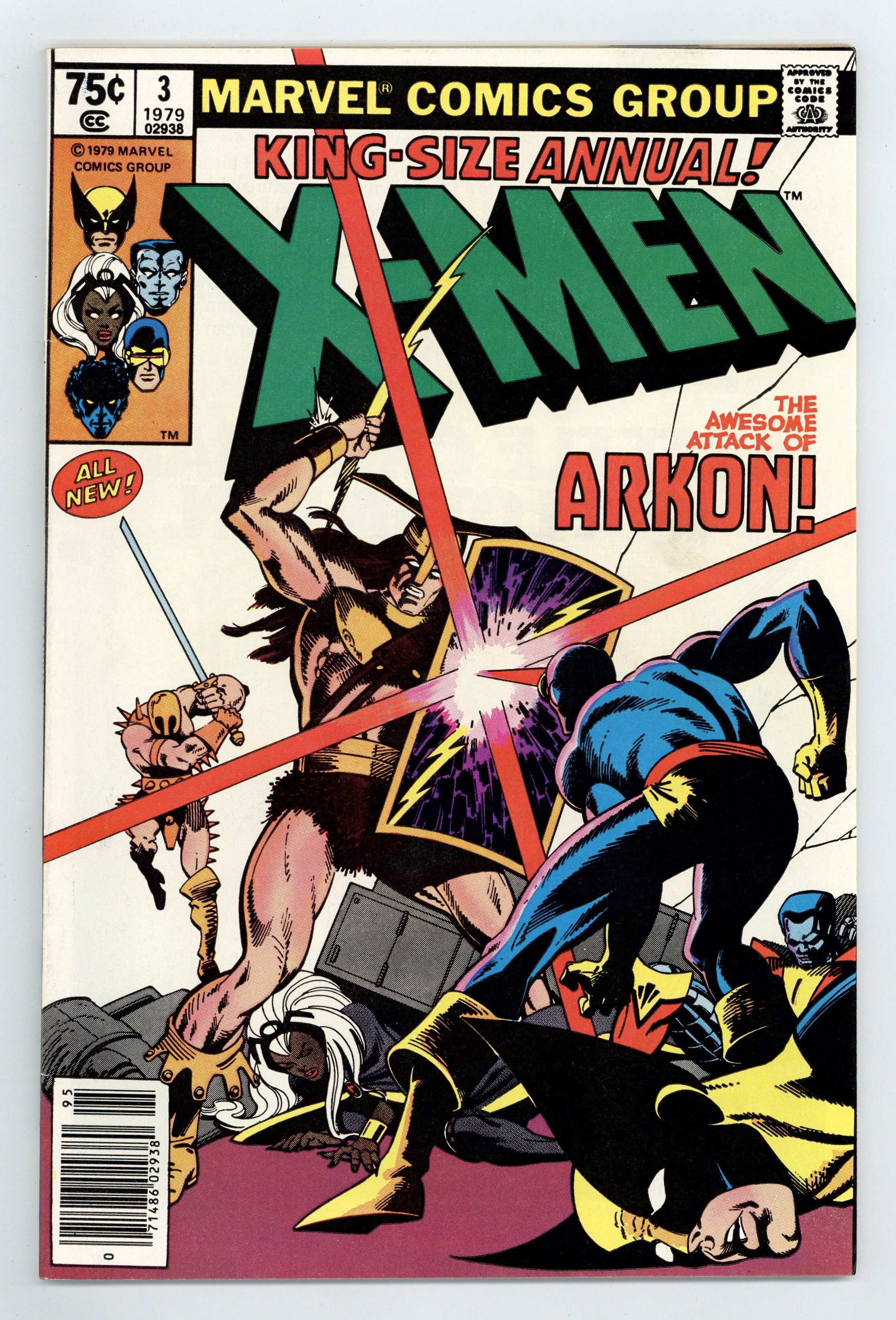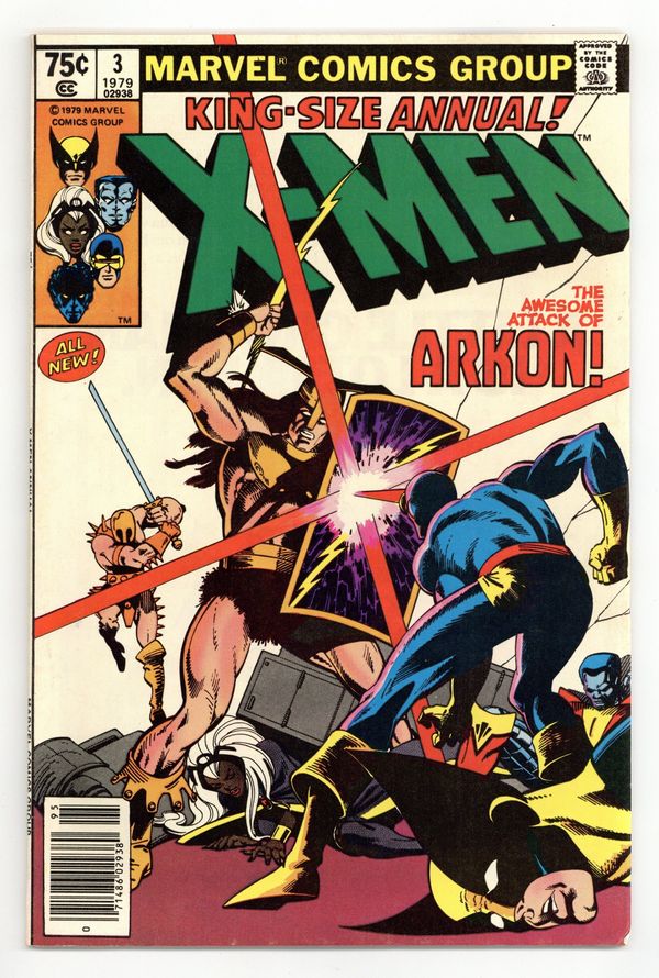 Tags: X-Men$20.00Newsstand Edition. A Fire in the Sky! - Written by Chris Claremont. Art by George Pérez and Terry Austin. Cover by Frank Miller and Terry Austin. The X-Men battle Arkon and are transported to his world where they are asked to help save it. Story takes place between Uncanny X-Men (1963 1st Series) #124 and 125. Characters in this issue: X-Men [Cyclops; Storm; Wolverine; Colossus; Nightcrawler; Banshee]; Edwin Jarvis; VILLAINS: Arkon; Imperions; CAMEO FLASHBACK: Captain America [Steve Rogers]; Thor; Iron Man [Tony Stark]. 52 pages, full color. Cover price $0.75.