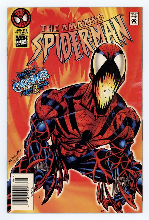 Tags: Spider-Man$35.00Newsstand Edition. Cover pencils by Mark Bagley, inks by Larry Mahlstedt. It's Carnage versus Spidey in Web of Carnage Part 2 of 4, "And Now - Spider-Carnage," script by Tom DeFalco, pencils by Mark Bagley, inks by Larry Malhstedt and Randy Emberlin; Spidey and Peter learn the Spider-skeleton is an actual Spider-Man clone and that Ben's girlfriend Jessica Carradine is the Burglar's daughter (SenSM #3, '96); Meanwhile, Carnage terrorizes the city even though Cletus Kasady is safe in his cell; Seeking answers, Spidey follows Ravencroft guard Dickerson to an underground super-villain-worshipping club where Dickerson sells Carnage memorabilia filched from Ravencroft; Carnage attacks the club, and battles Spidey, escaping after bringing down the roof; At the Daily Bugle, Jessica gets a job to photograph Spidey as a public menace; Spidey tails Ravencroft security chief John Jameson, discovering him possessed by the Carnage symbiote. The story continues from Sensational Spider-Man 3 and continues in Spider-Man 67. 36 pgs., full color. $1.50. Cover price $1.50.