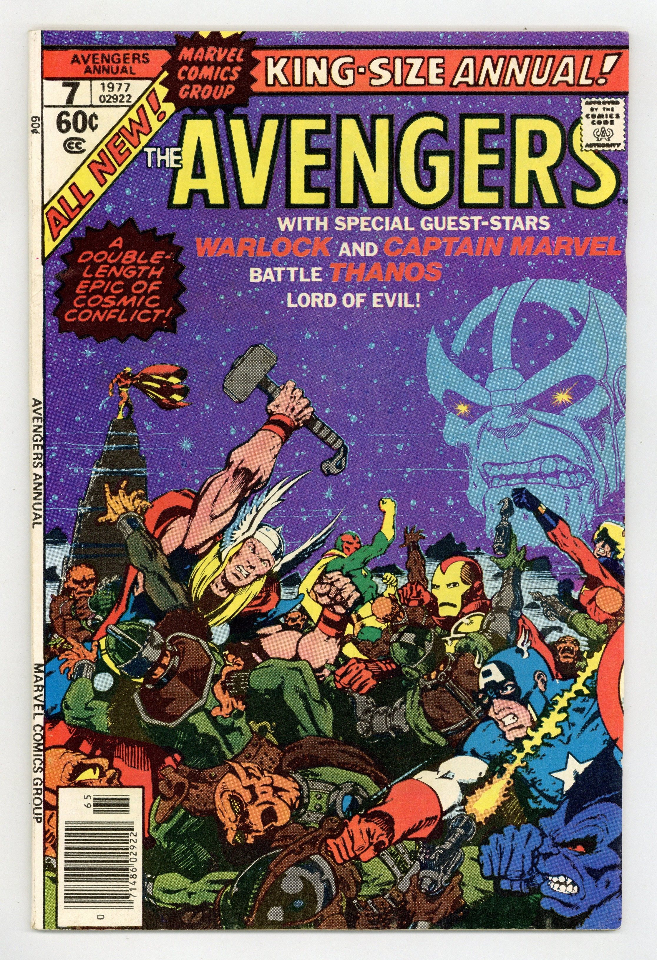 "The Final Threat" Part 1 of 2. Guest-starring Captain Marvel and Adam Warlock. Script by Jim Starlin. Art by Jim Starlin (breakdowns) and Joe Rubinstein (finishes). Cover by Jim Starlin. One of the epochal annuals of the bronze age! A stormy night at Avengers Mansion is interrupted by the sudden arrival of Captain Marvel and Moondragon. The duo feels that the universe is in imminent danger! Their fears are confirmed moments later when Adam Warlock also arrives and delivers troubling news: Thanos has a new plan for obliterating the universe! The evil Titan sends a giant space armada to attack Earth, while he prepares to blow up the sun via his massive star gem! However, the mightiest heroes on Earth intercept the fleet and set their sights on destroying Thanos' instrument of stellar genocide! Tragically though, Warlock falls in battle vs. the mad Titan. Leaving the trio of Iron Man, Thor, and Captain Marvel as the final hope of the universe! Can the Kree warrior, thunder god, and golden avenger triumph over Thanos? Story continues in Marvel Two-in-One Annual 2. Deaths of Gamora, Pip, and Warlock. Avengers lineup: Beast, Captain America, Iron Man, Scarlet Witch, Thor, and the Vision. (Notes: First appearances of the Space Gem, the Mind Gem, and the Reality Gem, and the first time all six Infinity Gems were in a story. Thanos previously appeared in Warlock 15. This annual was reprinted in 1993 in the trade paperback: The Greatest Battles of the Avengers.) 52 pgs. Cover price $0.60.