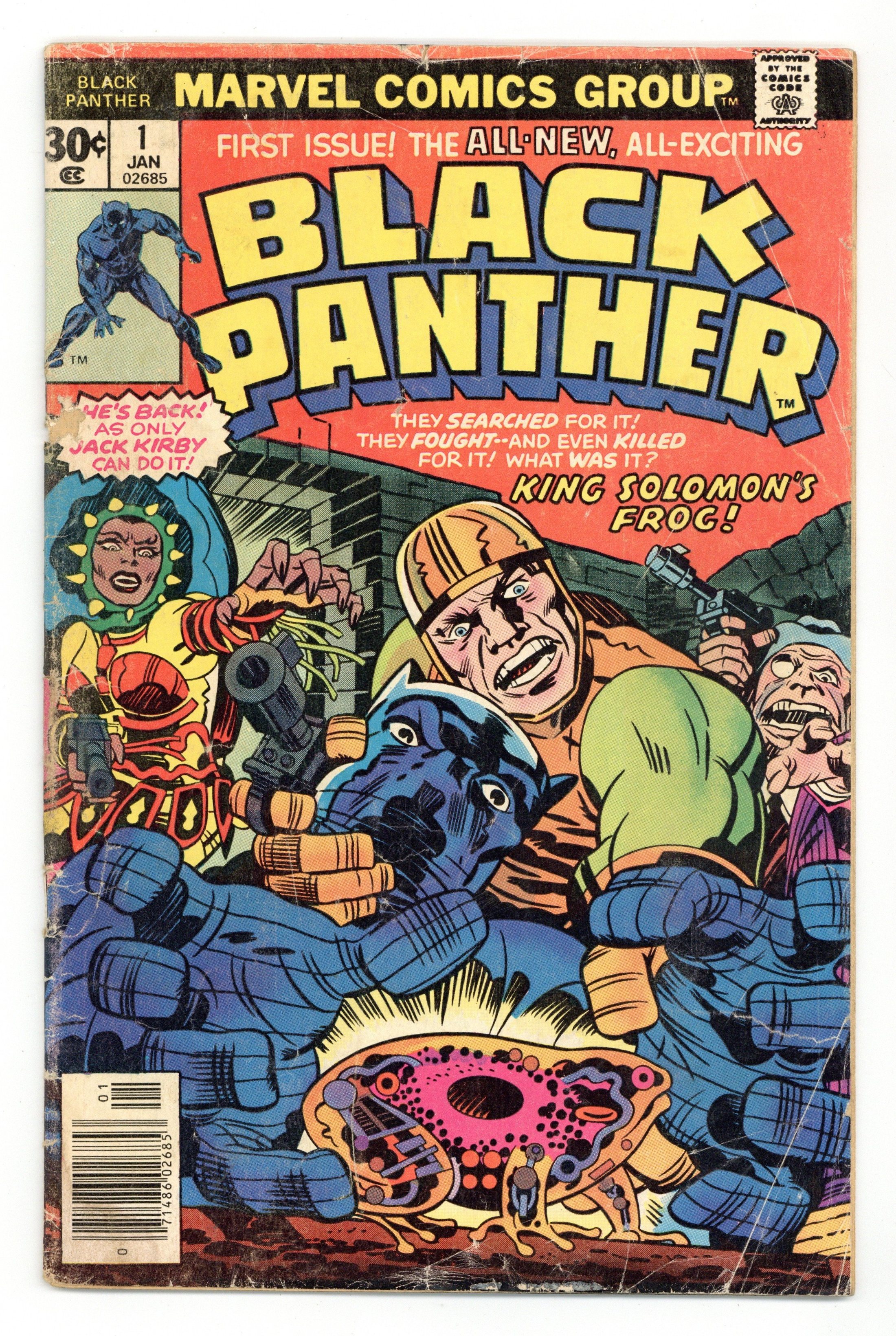 Ends Mar 16 7:39 PM CST Bid History 2 bids Current Bid $16 Your Secret Max Bid If you'd like to bid, please log in or register. Cover pencils by Jack Kirby, inks by John Verpoorten. King Solomon's Frog!, script and pencils by Jack Kirby, inks by Mike Royer; Black Panther helps Abner Little, a member of the Collectors, recover the Brass Frog, an ancient time machine; Due to its dangerous nature, the Frog had previously been hidden away by the Black Panther's grandfather, Azzuri, but was taken by Alfred Queely, a fellow member of the Collectors; After getting the Frog, the Black Panther and Little are attacked by Princess Zanda, another member of the Collectors, for control of the artifact. During the battle, the Frog is activated and a mysterious creature, Hatch-22, appears. Jack Kirby writes about what readers can expect from his new Black Panther. 36 pgs. $0.30. Cover price $0.30.
