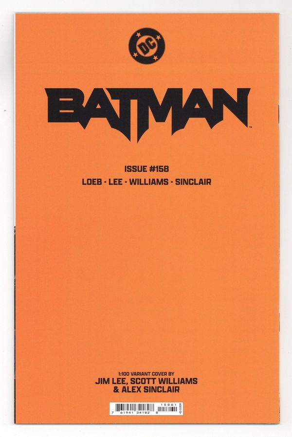 Tags: Batman$50.00Limited 1 for 100 Retailer Incentive Variant Cover. Written by Jeph Loeb. Art by Jim Lee, Scott Williams. Cover by Jim Lee, Scott Williams. THE HOTLY ANTICIPATED SEQUEL TO THE SMASH-HIT STORYLINE! Jeph Loeb! Jim Lee! An all-new epic saga begins here. Hush returns! 40 pages, full color. Rated T+ Cover price $5.99.