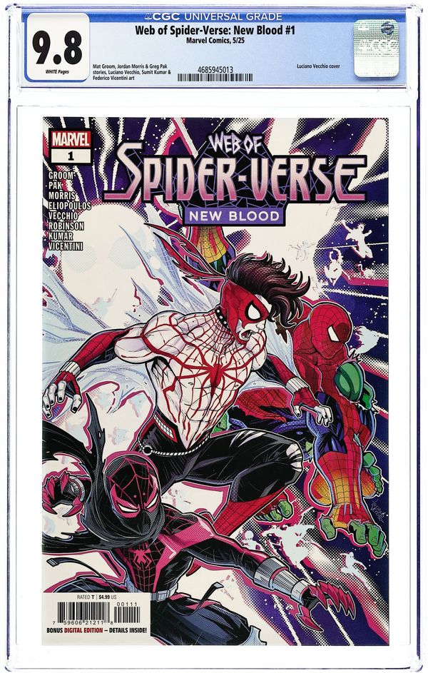 Written by Mat Groom; Greg Pak, Various. Art by Federico Vicentini; Marvel Various. Cover by Luciano Vecchio. THE WAR OF THE MULTIVERSE IS COMING! Spider-Man and his spider-compatriots across the Spider-Verse are the guardians of the Web of Life and Destiny…but they are heading for a confrontation with the OTHER Arachnid-Multiverse of the symbiote variety when they come into conflict with the VENOMVERSE! In the buildup to that 8-fisted confrontation, meet three new Spider-Versers to see who has what it takes to fight in the web wars! Could it be Count Parker? Spider-Prowler? Or maybe Spider-Hulk? Find out inside! 32 pages, full color. Rated T Cover price $4.99.