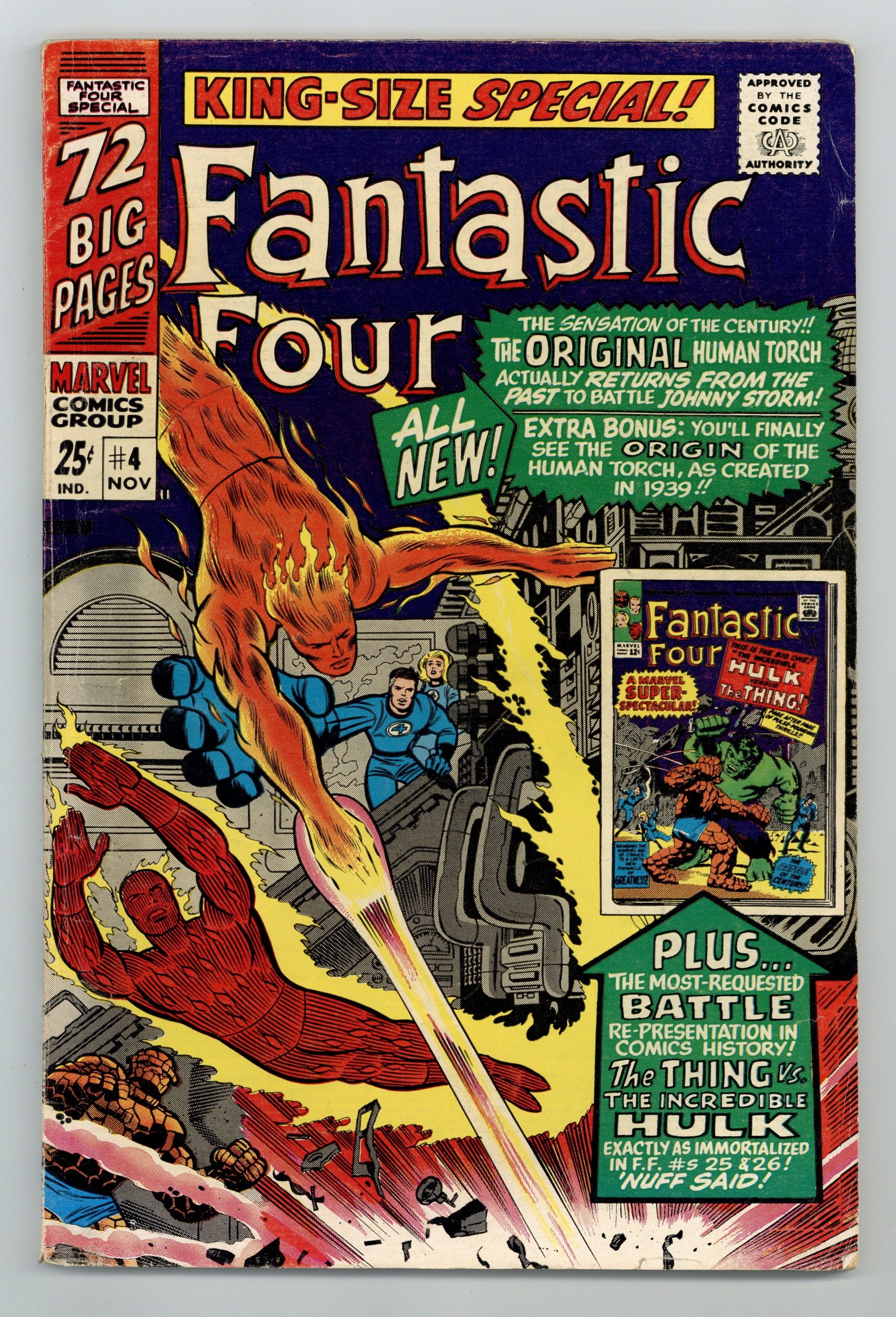 The Golden Age Human Torch guest stars (his first Silver Age appearance) in a new story, "The Torch That Was!" Script by Stan Lee, pencils by Jack Kirby, inks by Joe Sinnott. This issue also reprints the first clash between The Hulk and Thing from Fantastic Four numbers 25 and 26 ("The Hulk vs. the Thing" and "The Avengers Take Over"). Kirby/Sinnott cover. 76 pgs. Cover price $0.25.
