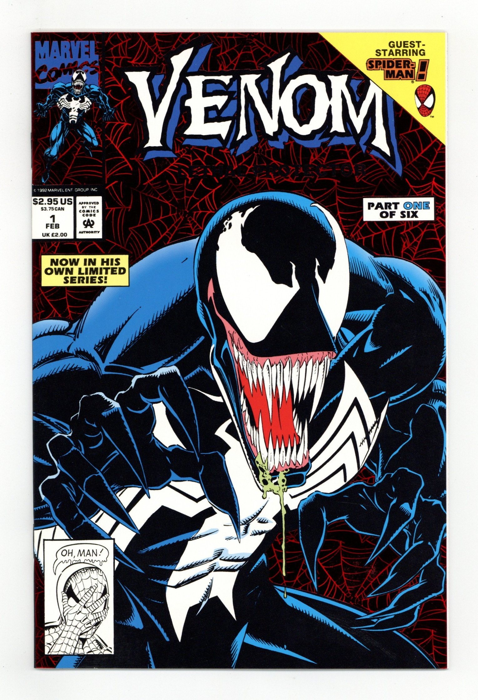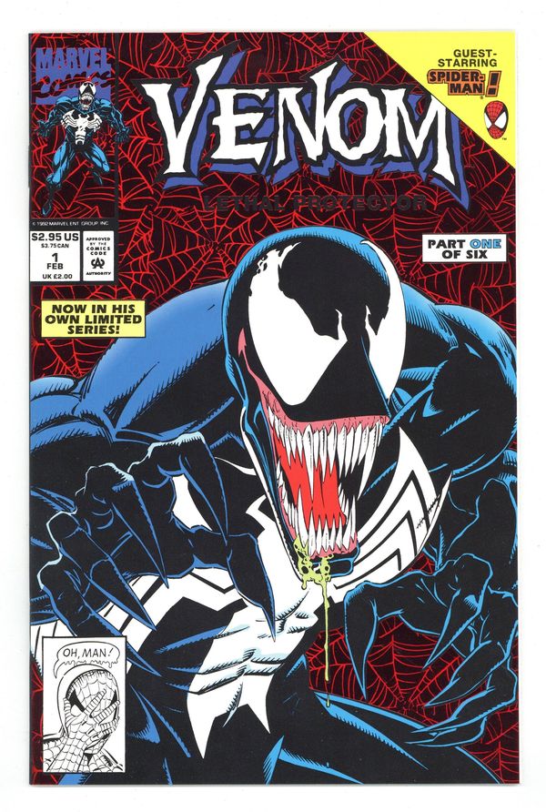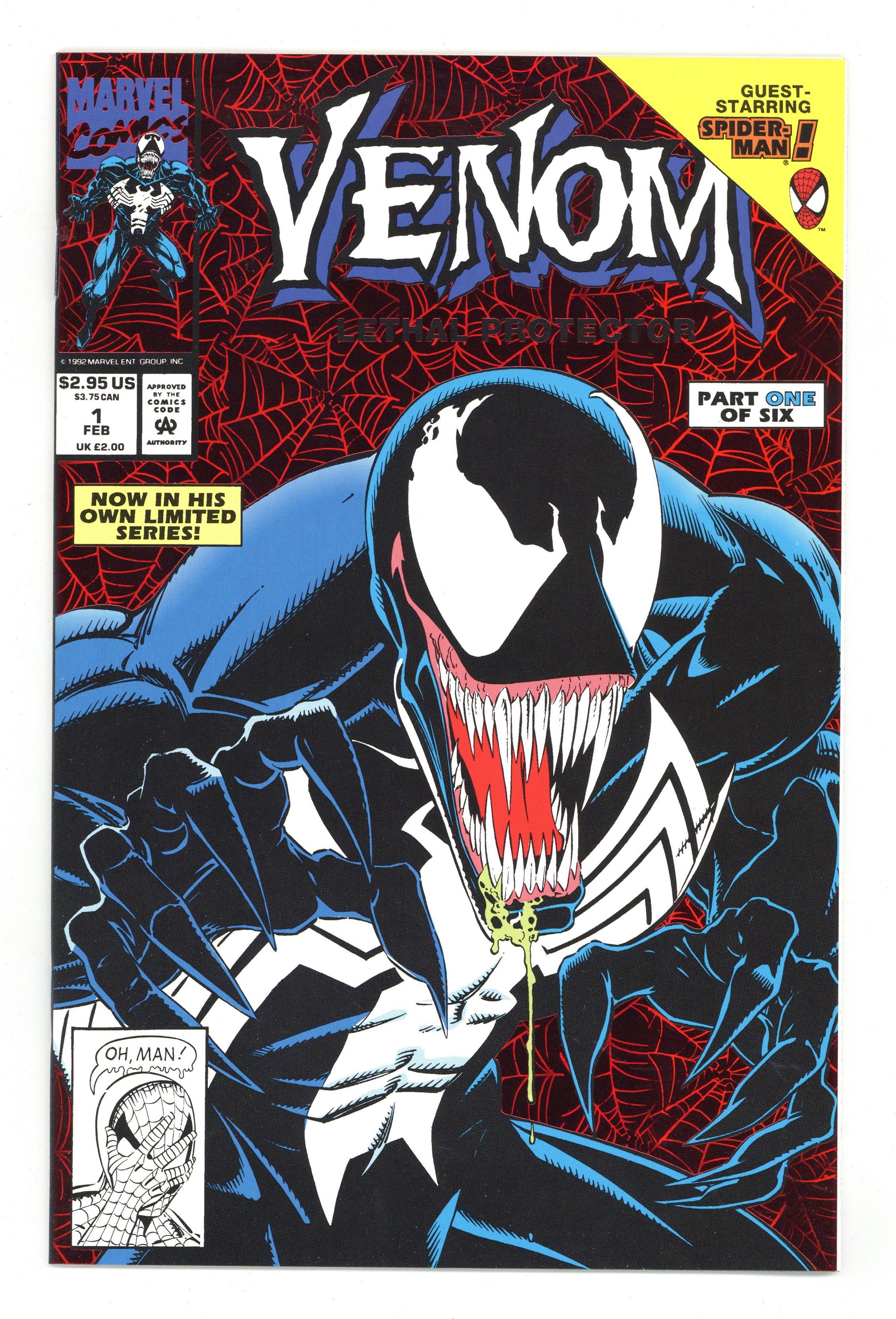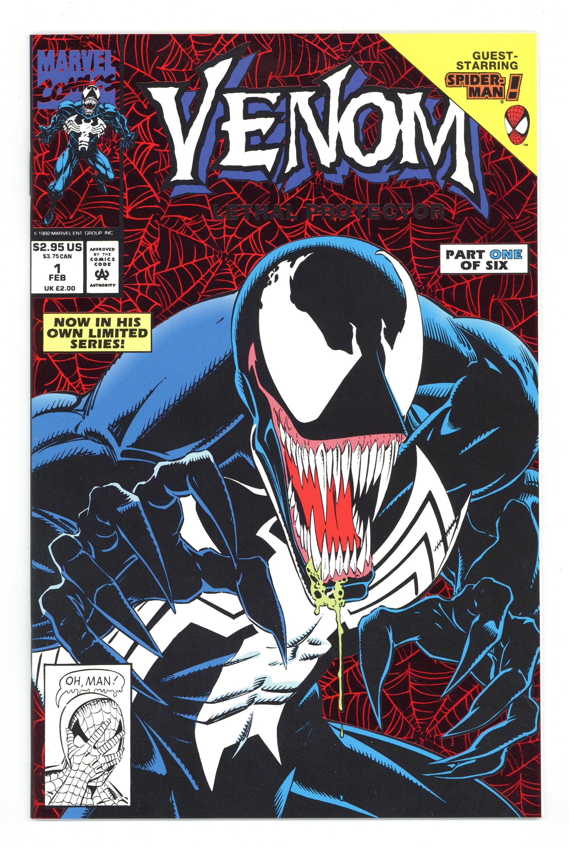 Tags: Marvel Legacy Numbering: Venom (part 1)$46.00Direct Edition. Red Foil Enhanced CardStock cover, art by Mark Bagley and Sam de la Rosa. Lethal Protector Part 1: Dark Soul Drifting, script by David Michelinie, pencils by Mark Bagley, inks by Al Milgrom and Sam de la Rosa; Venom moves to San Fransisco to try out his new protection of innocents racket; Venom and Spidey save a group of homeless folk. 36 pgs., full color. $2.95. Cover price $2.95.