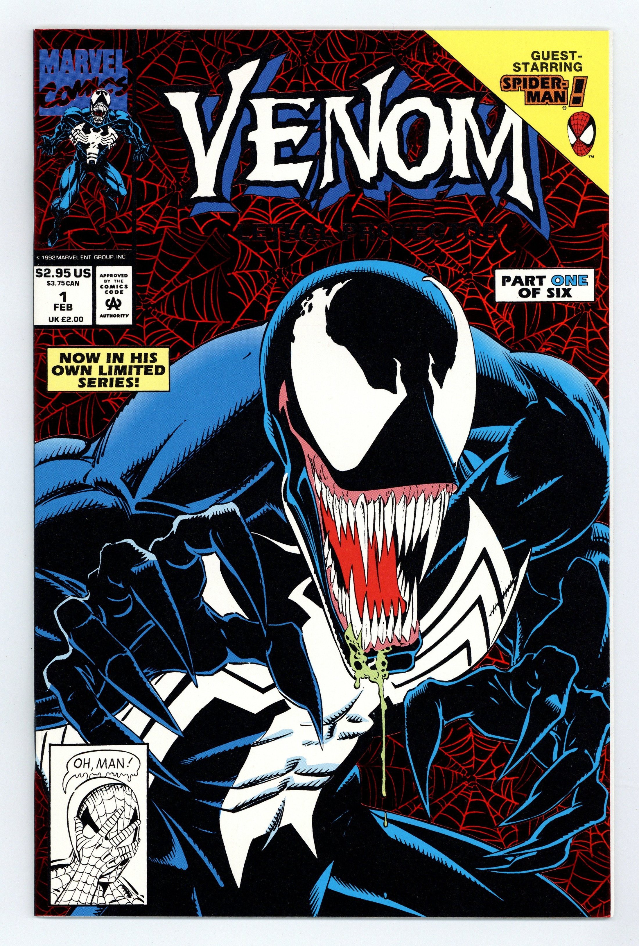 Direct Edition. Red Foil Enhanced CardStock cover, art by Mark Bagley and Sam de la Rosa. Lethal Protector Part 1: Dark Soul Drifting, script by David Michelinie, pencils by Mark Bagley, inks by Al Milgrom and Sam de la Rosa; Venom moves to San Fransisco to try out his new protection of innocents racket; Venom and Spidey save a group of homeless folk. 36 pgs., full color. $2.95. Cover price $2.95.