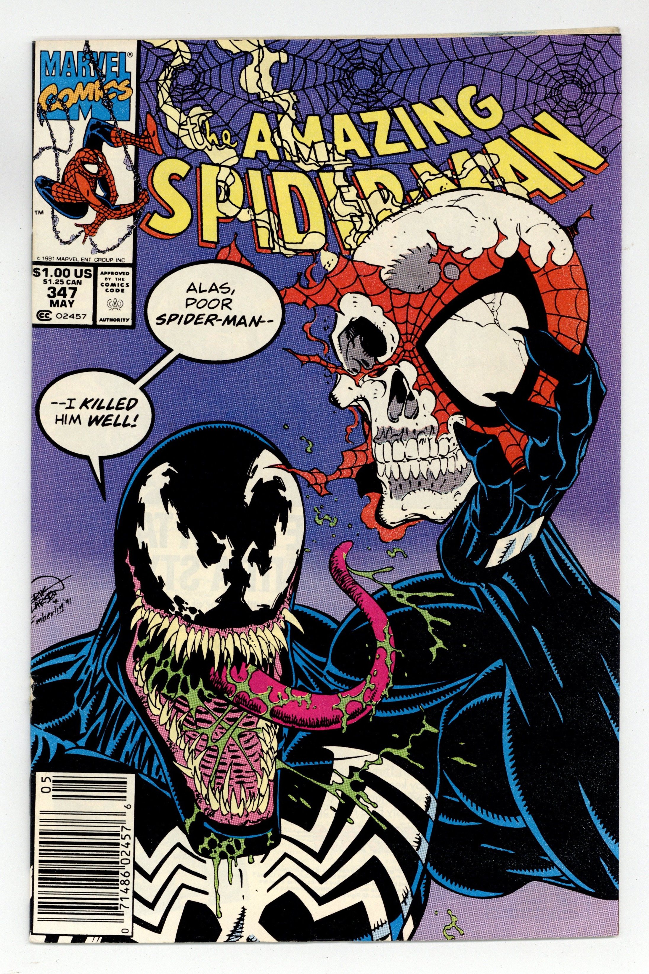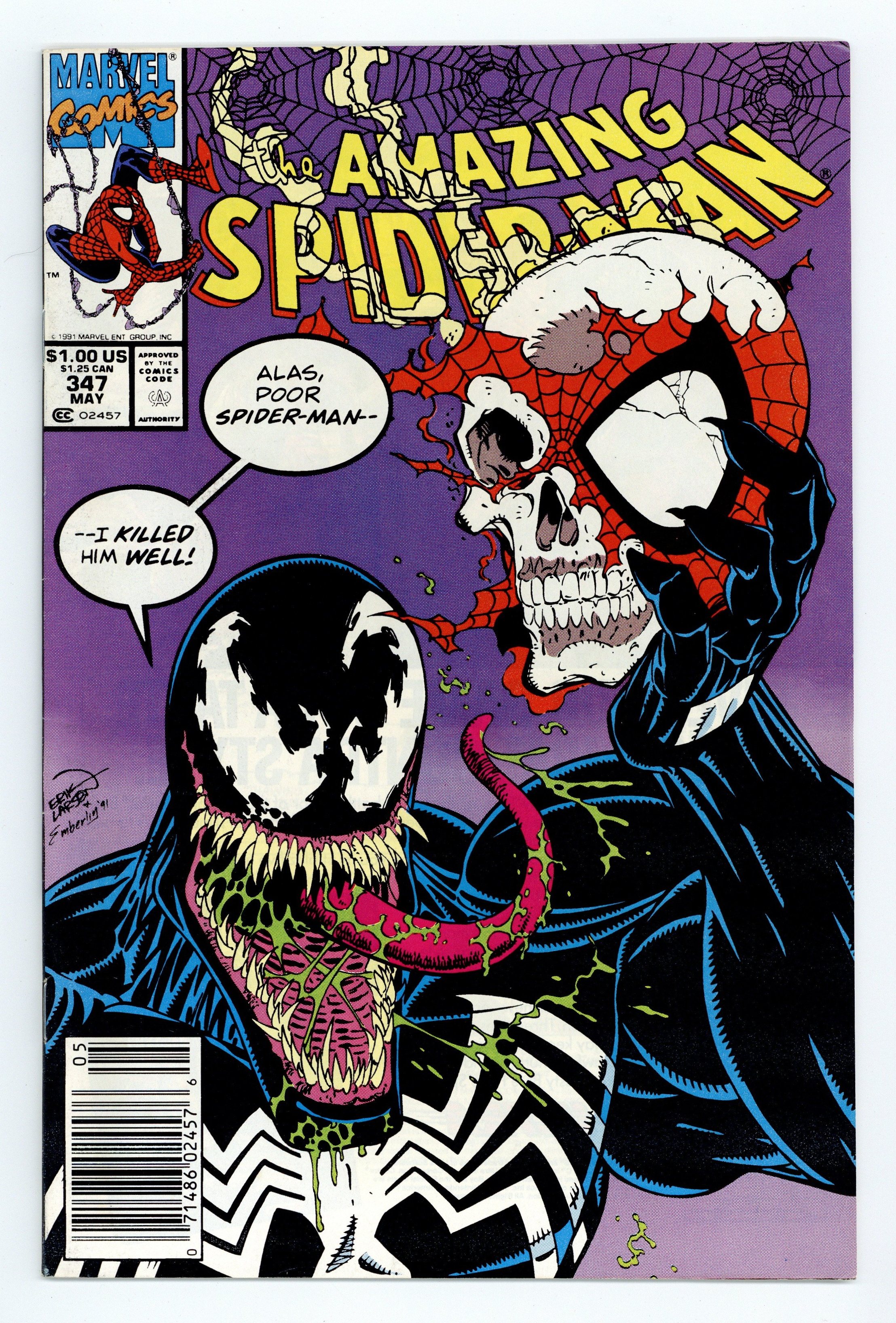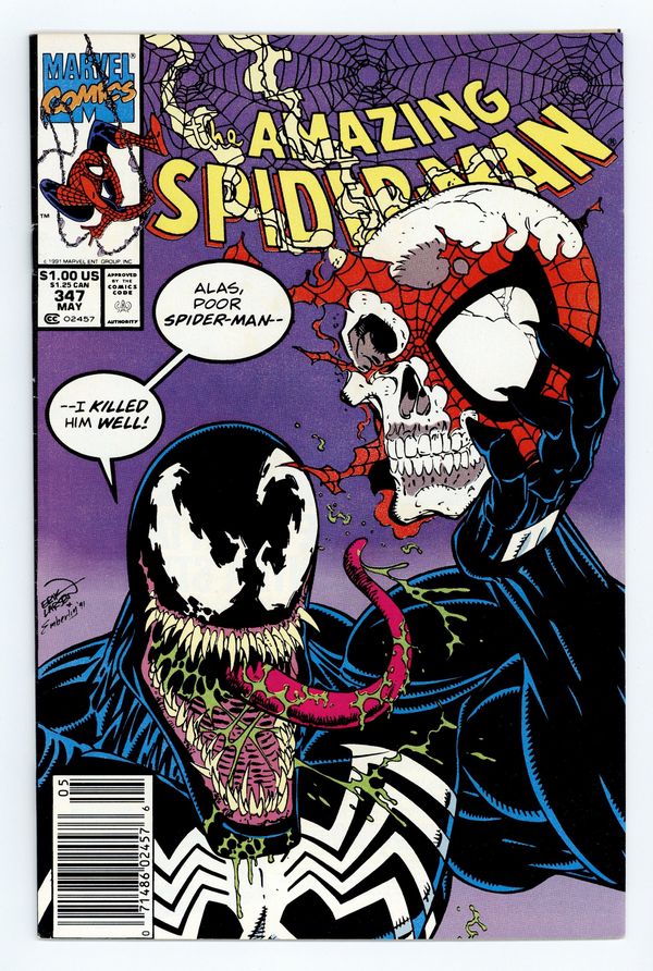 Newsstand Edition. "The Boneyard Hop!" Part 2 of 2. Script by David Michelinie. Pencils by Erik Larsen. Inks by Randy Emberlin. Cover by Erik Larsen and Randy Emberlin. On a deserted island, the Amazing Spider-Man wages a desperate battle for survival vs. the vicious Venom! The wall-crawler is fighting for his life! While Venom is fighting for his death! And this time there isn't any help or rescue on the way! As shown on the twisted cover, Venom plans to quote Hamlet once the battle is over! If the spectacular one doesn't want to play the part of Yorick; he better move fast! To thine own self be true, web-slinger! Cameo appearances by Mary Jane Watson, Willie Lumpkin, Aunt May, Flash Thompson, and the Black Cat. (Notes: Venom appears next in Darkhawk 13 & 14. This two-part story was reprinted in the trade paperbacks: Spider-Man: Venom Returns (1993) and Spider-Man: The Vengeance of Venom (2011).) 36 pages. Cover price $1.00. Cover price $1.00.