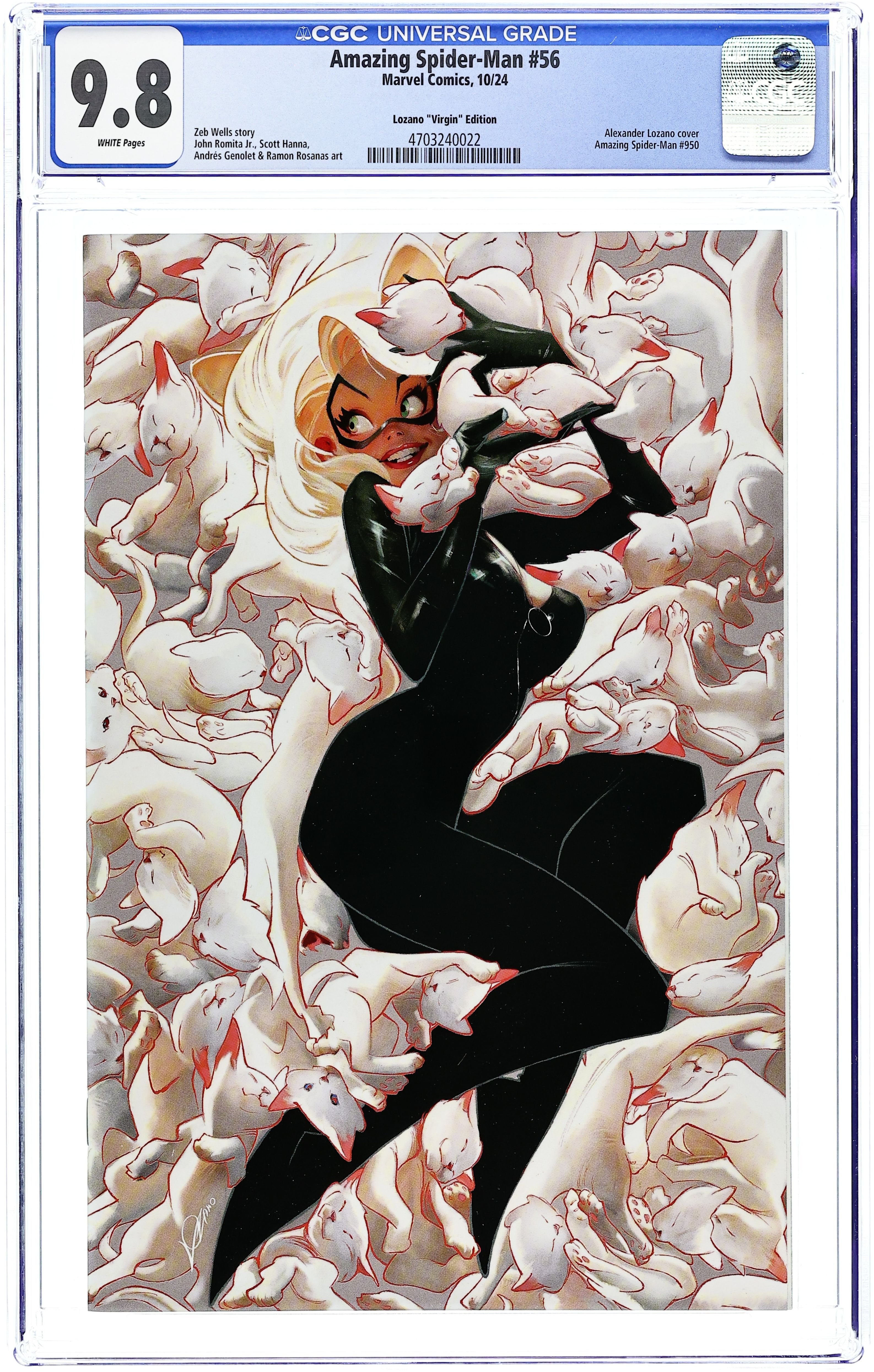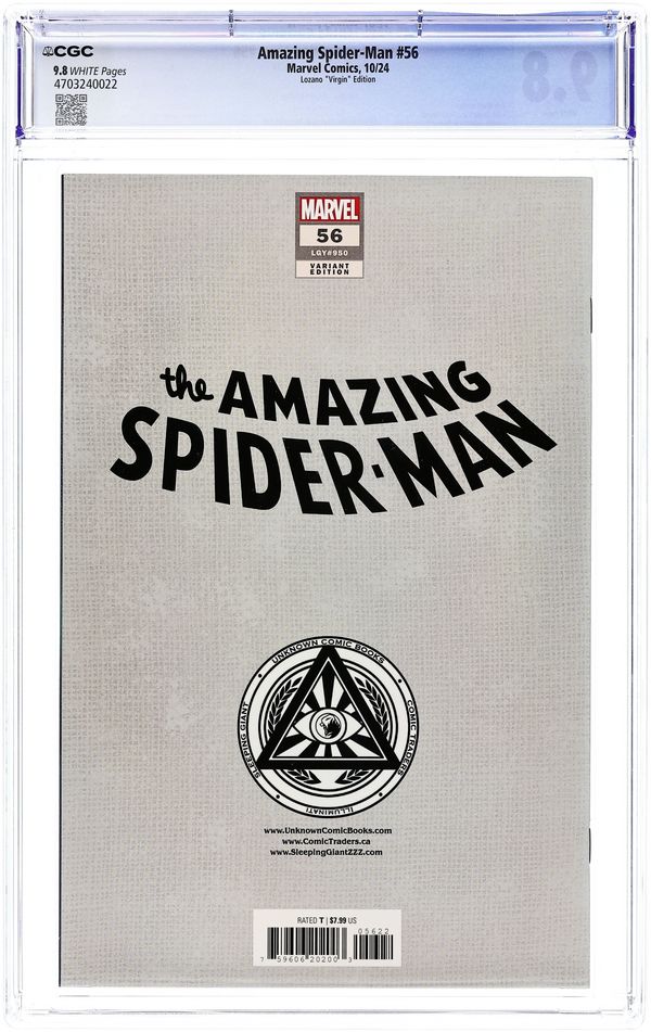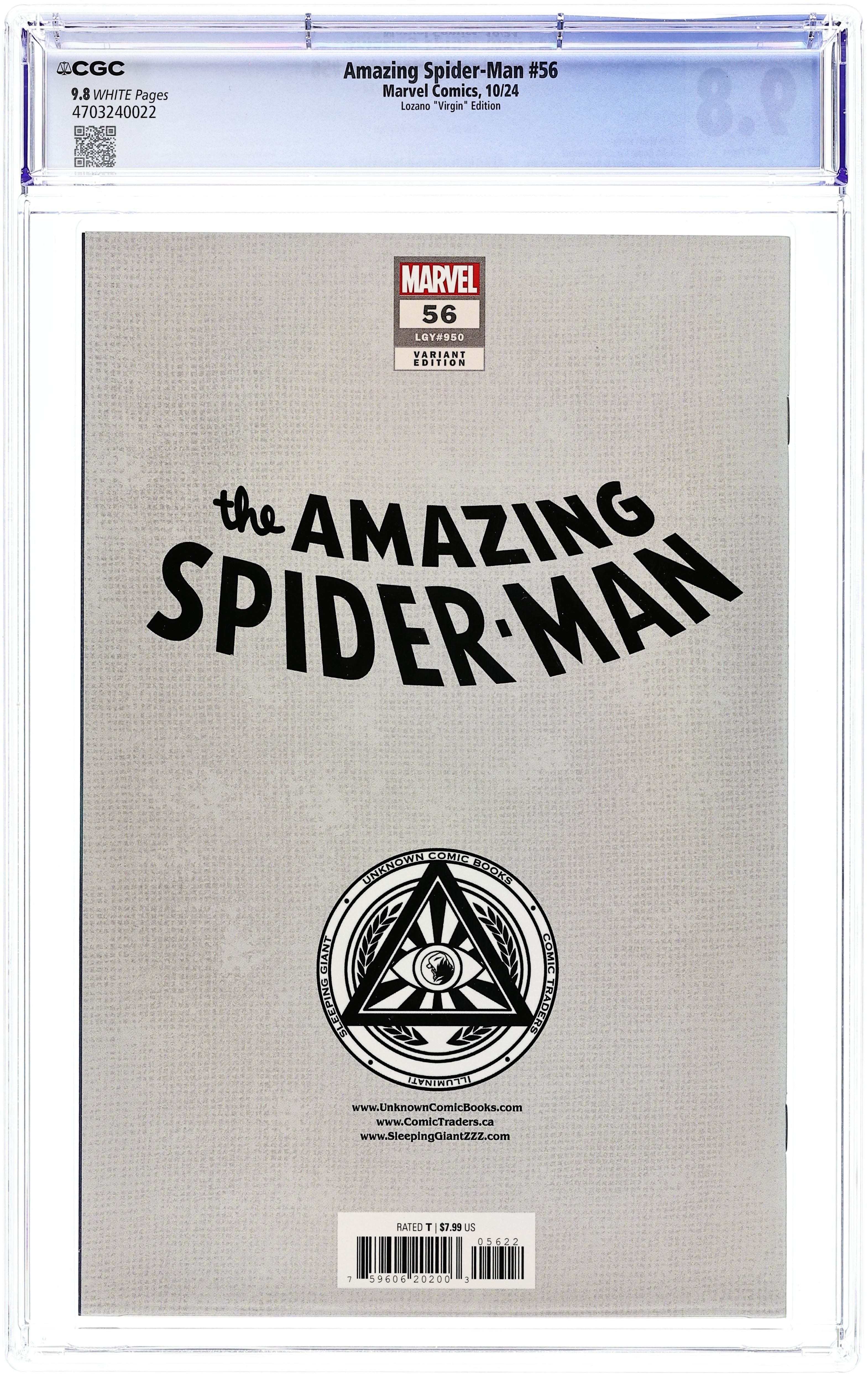 Comics Illuminati (Unknown Comic Books, Comic Traders, and Sleeping Giant) Exclusive Virgin Cover by Alexander Lozano. Written by Zeb Wells. Art by John Romita Jr. TOMBSTONE RETURNS IN A SPECIAL OVERSIZED LEGACY #950! The newst Kingpin of Crime will show his power to the other gangs of New York City by publicly killing Spider-Man. And of course the easiest way to get to Spidey is to kidnap…PETER PARKER?! On top of our oversized main adventure, this issue includes some new instant classic stories! 64 pages, full color. Rated T