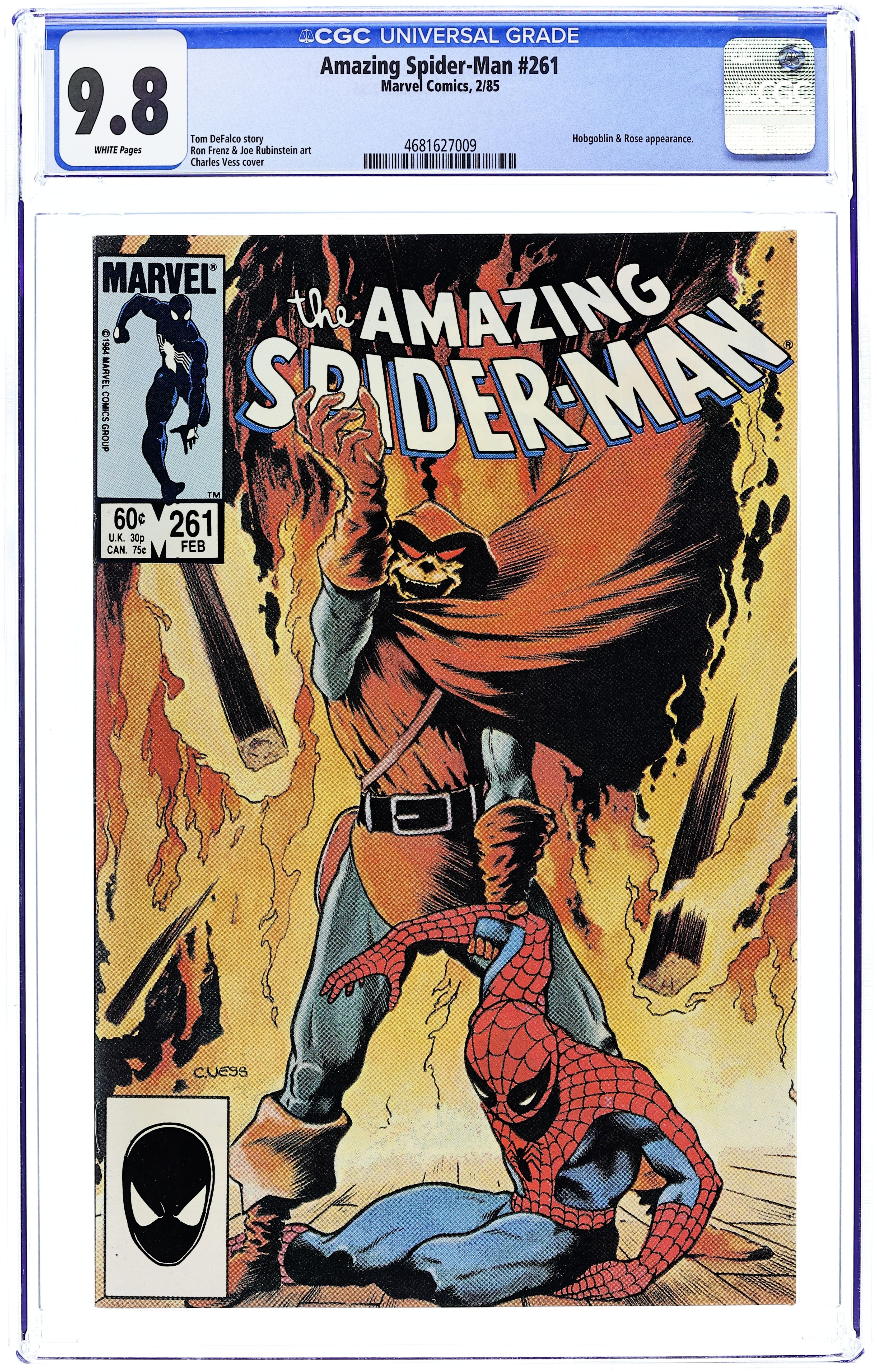 Direct Edition. "The Sins of My Father!" Script by Tom DeFalco. Pencils by Ron Frenz. Inks by Joe Rubinstein. Painted cover by Charles Vess. The situation has come down to this: Mary Jane, Harry, and Liz are trapped in the Rose's secret warehouse. The building is on fire. Liz is going into labor. And as shown on Charles Vess terrific cover, the vengeful Hobgoblin is on the attack! It's going to take a small miracle for the web-slinger to save his friends much less himself! With the flames closing in, can the Amazing Spider-Man stave off disaster at the hands of the Hobgoblin? A harrowing finish! Cameo appearance by the alien symbiote (costume). (Note: This story was reprinted in Marvel Tales 275.) 36 pages. Cover price $0.60.