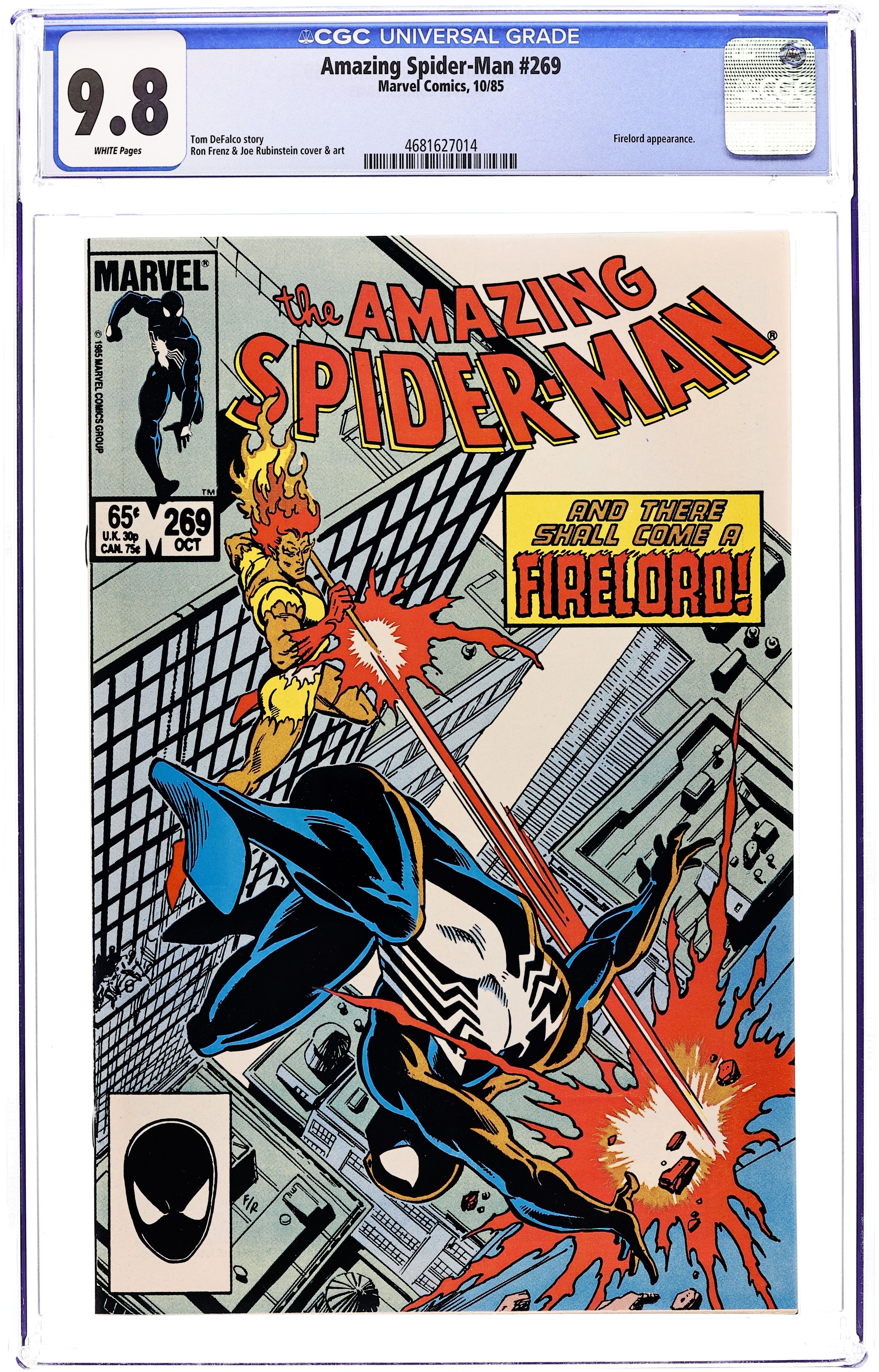 Direct Edition. "Burn, Spider, Burn!" Guest-starring Firelord. Part 1 of 2. Script by Tom DeFalco. Pencils by Ron Frenz. Inks by Joe Rubinstein. Cover by Ron Frenz and Joe Rubinstein. Firelord walks the Earth! And the former herald of Galactus is stirring up trouble in the Big Apple! On his way home from dinner at Aunt May's, the wondrous wall-crawler intercepts the cosmic-powered herald near the East River! However the web-slinger quickly realizes that he needs help from the Avengers or the Fantastic Four! Unable to locate either super team, the wall-crawler thinks about escaping Firelord by simply changing into his civilian clothes! But that course of action would be shirking his responsibility! So it's up to one hero to stop Firelord: the Amazing Spider-Man! (Notes: Firelord previously appeared in Thor 306. This two-part story was reprinted in Marvel Tales 279 & 280.) 36 pages Cover price $0.65.